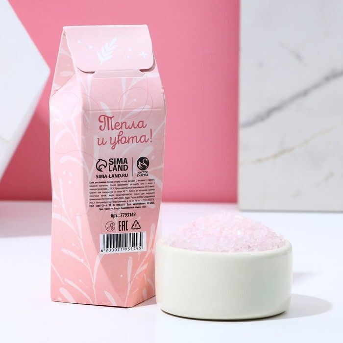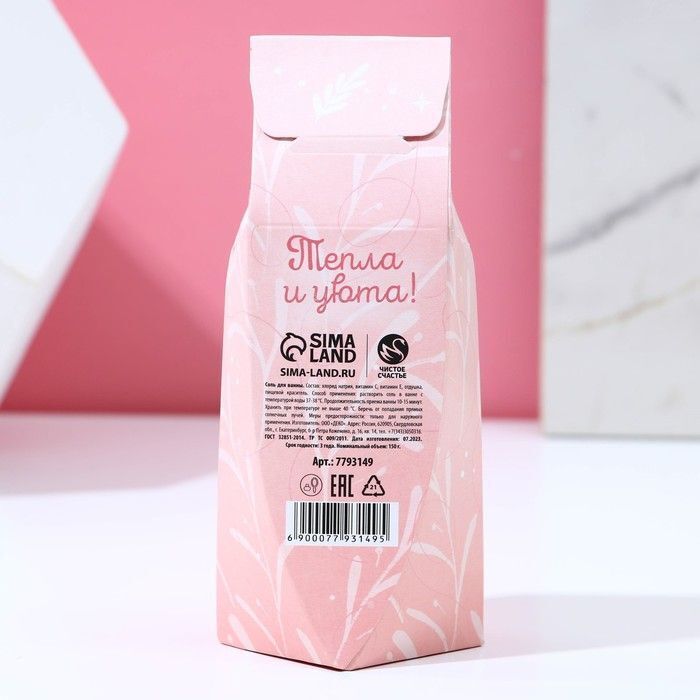Соль упакована в стильную картонную коробку нежных розовых и белых оттенков, что делает ее отличным подарком для близких. Объем упаковки составляет 150 г, что достаточно для нескольких применений. Не упустите возможность добавить в свою жизнь немного волшебства с солью для ванны «Волшебной зимы!»