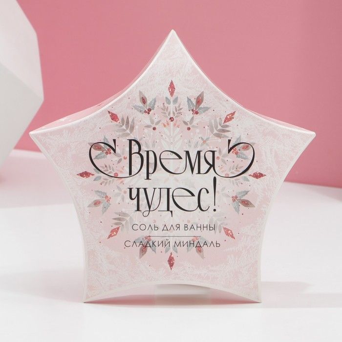 Упаковка выполнена в форме звезды и имеет светло-розовый цвет с декоративными элементами. Объем упаковки составляет 150 г, что идеально подходит для одной процедуры. Соль имеет кристаллическую структуру и светло-розовый цвет, что делает ее не только полезной, но и эстетически привлекательной.