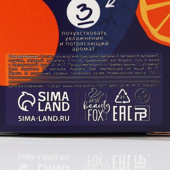 Упаковка содержит 100 г продукта, что достаточно для одной полноценной ванны. Соль имеет оранжевый цвет и крупные кристаллы, что делает её визуально привлекательной. Упаковка оформлена в ярких цветах с изображениями апельсинов, что создает ощущение свежести и фруктовости. Не упустите возможность сделать свои водные процедуры более приятными и полезными!