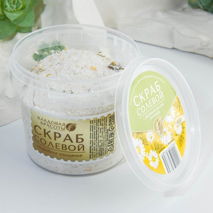 - Натуральные ингредиенты: скраб содержит морскую соль и эфирное масло ромашки, что обеспечивает бережное очищение и увлажнение.