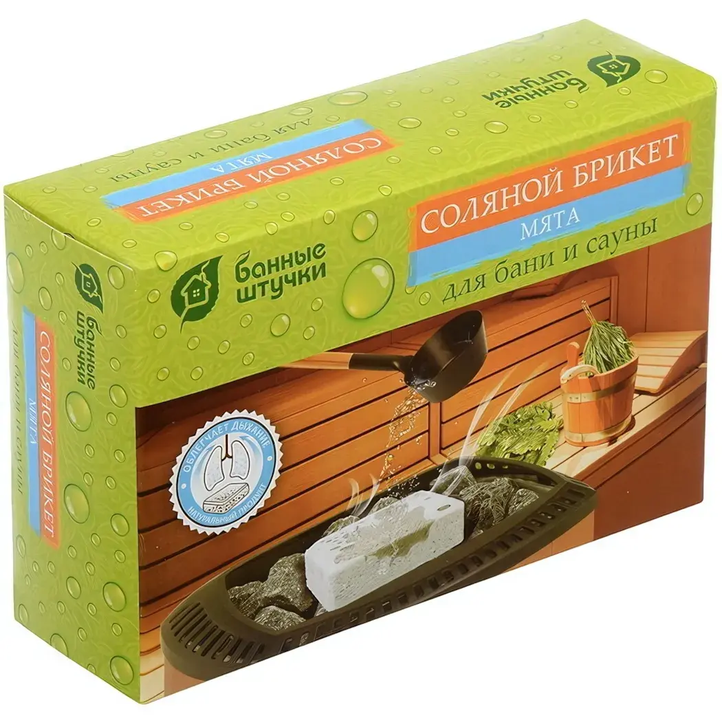 Объём одного брикета — 1300 г. Брикет выполнен из кристаллической соли с добавлением мятных трав, отличается прямоугольной формой и плотной упаковкой зелёного цвета. Идеально подходит для домашней или профессиональной парной. Используйте регулярно для поддержания здорового дыхания и гладкости кожи — структурированный подход к уходу за собой становится ещё проще.