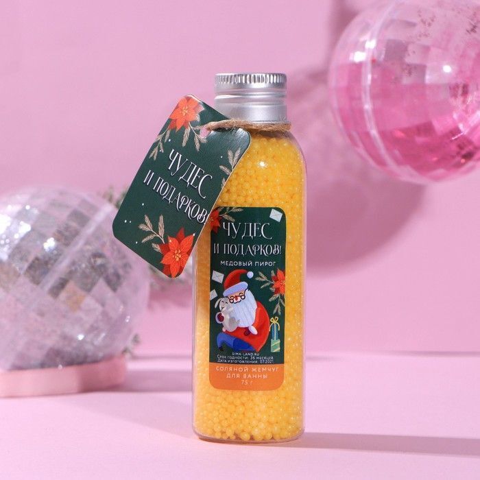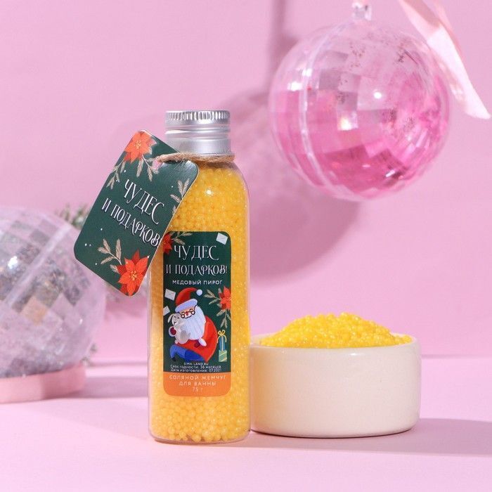 Погрузитесь в атмосферу уюта и расслабления с соляным жемчугом для ванны «Чудес и подарков!» с ароматом медового пирога. Этот продукт создан для того, чтобы сделать ваши водные процедуры по-настоящему волшебными. Наполните ванну теплой водой, добавьте 75 граммов жемчуга и наслаждайтесь нежным ароматом, который окутывает вас, создавая атмосферу праздника и уюта.