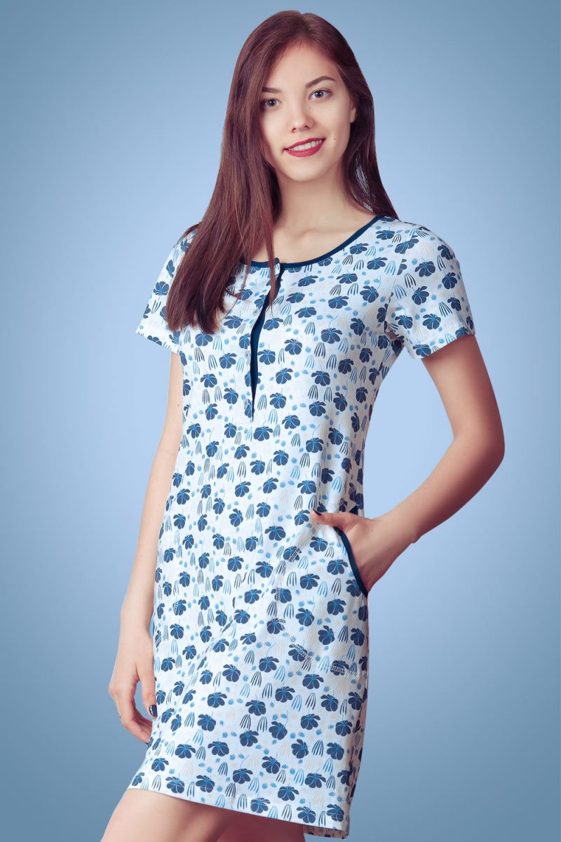 Светлая цветовая гамма с нежным сине-голубым цветочным принтом создаёт спокойное и умиротворяющее настроение. Эта сорочка станет отличным выбором для отдыха дома, тёплых летних ночей или в качестве практичного и красивого элемента домашнего гардероба. Отгружается в размере XXXL.