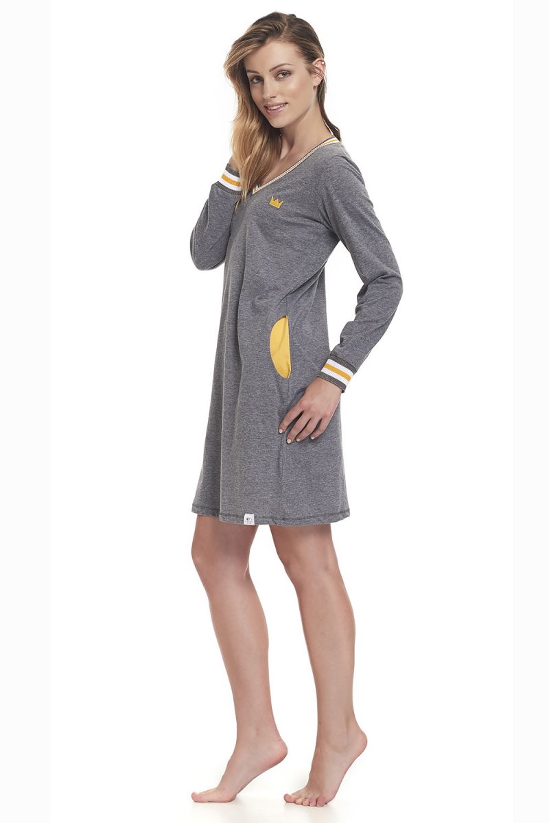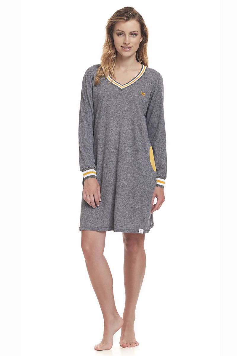 Эта женская сорочка из мягкой смесовой ткани станет вашим любимым предметом домашней одежды. Свободный крой и удобная длина до колен обеспечивают полную свободу движений, а яркие желтые акценты на воротнике и манжетах добавляют образу игривости и стиля.