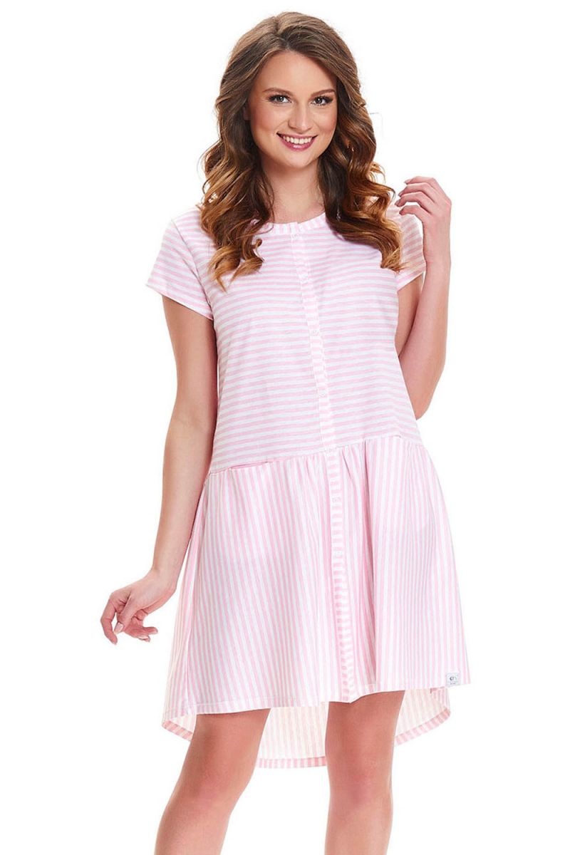 Сорочка выполнена в классическом стиле с тонкими вертикальными и горизонтальными полосками нежно-розового цвета. Модель отличается продуманным кроем:
