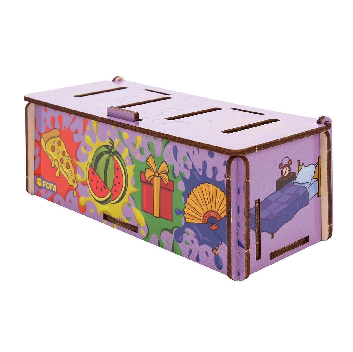 Деревянная коробка размером удобна для детских ручек. 30 карточек с изображениями предметов быта распределены по категориям: спальня, кухня, ванная. Через прорези в крышке нужно разместить карточки соответствующей формы.