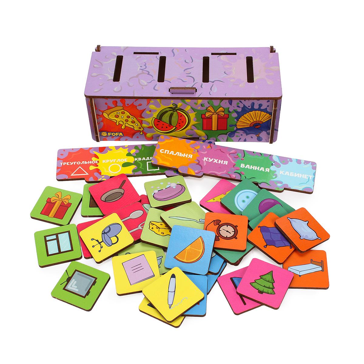 Комплектация: коробка-сортер, 2 вкладыша, 30 карточек