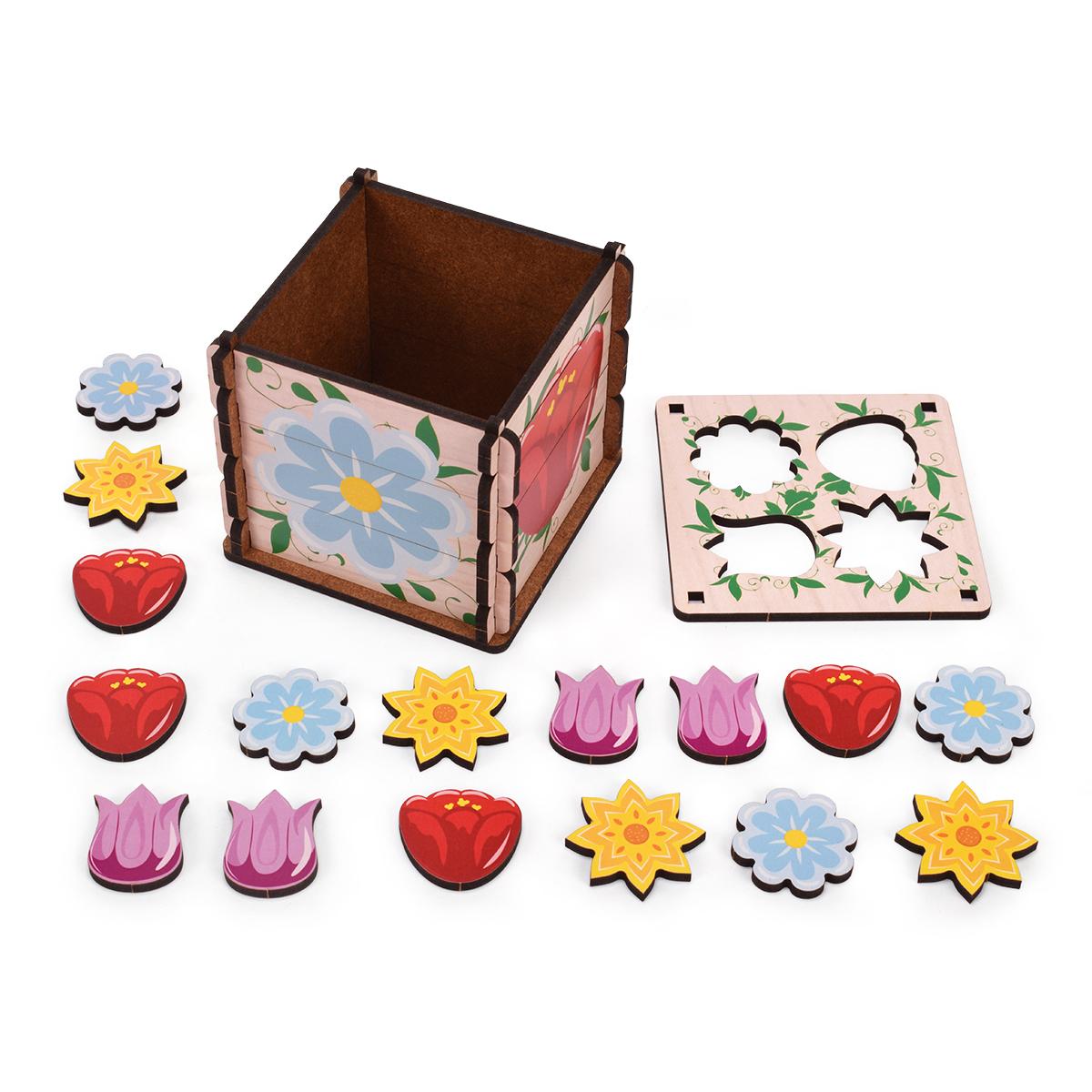 Первая задача – собрать куб из частей 3D-пазла. Это развивает логическое мышление, внимание и мелкую моторику. После сборки куб превращается в сортер: ребенок учится сопоставлять цветы и фигуры с вырезами на крышке. Каждый этап игры приносит новые открытия!