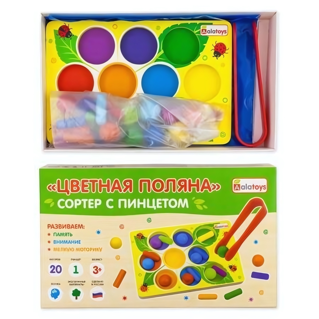 Размер упаковки составляет 22,5 х 13,5 х 5 см, что делает его удобным для хранения и транспортировки. Игрушка упакована в картонную коробку, что также добавляет ей привлекательности. В комплект входят: пинцет, деревянная подставка в форме цветка, а также 16 ярких деревянных шариков и палочек. Сортер "Цветная поляна" станет отличным подарком для вашего ребенка и поможет ему развиваться в игре!