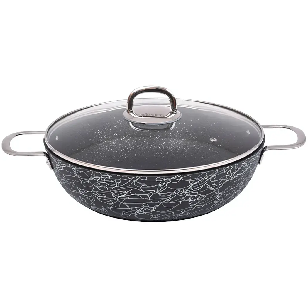 Размеры сотейника составляют 30х8,5 см, а его стильный черный цвет с белым узором добавляет элегантности вашей кухне. Стеклянная крышка с металлическим ободком и ручкой обеспечивает удобство в использовании и легкость в уходе. Этот сотейник станет отличным дополнением к вашей кухонной посуде и поможет вам готовить вкусные и полезные блюда.