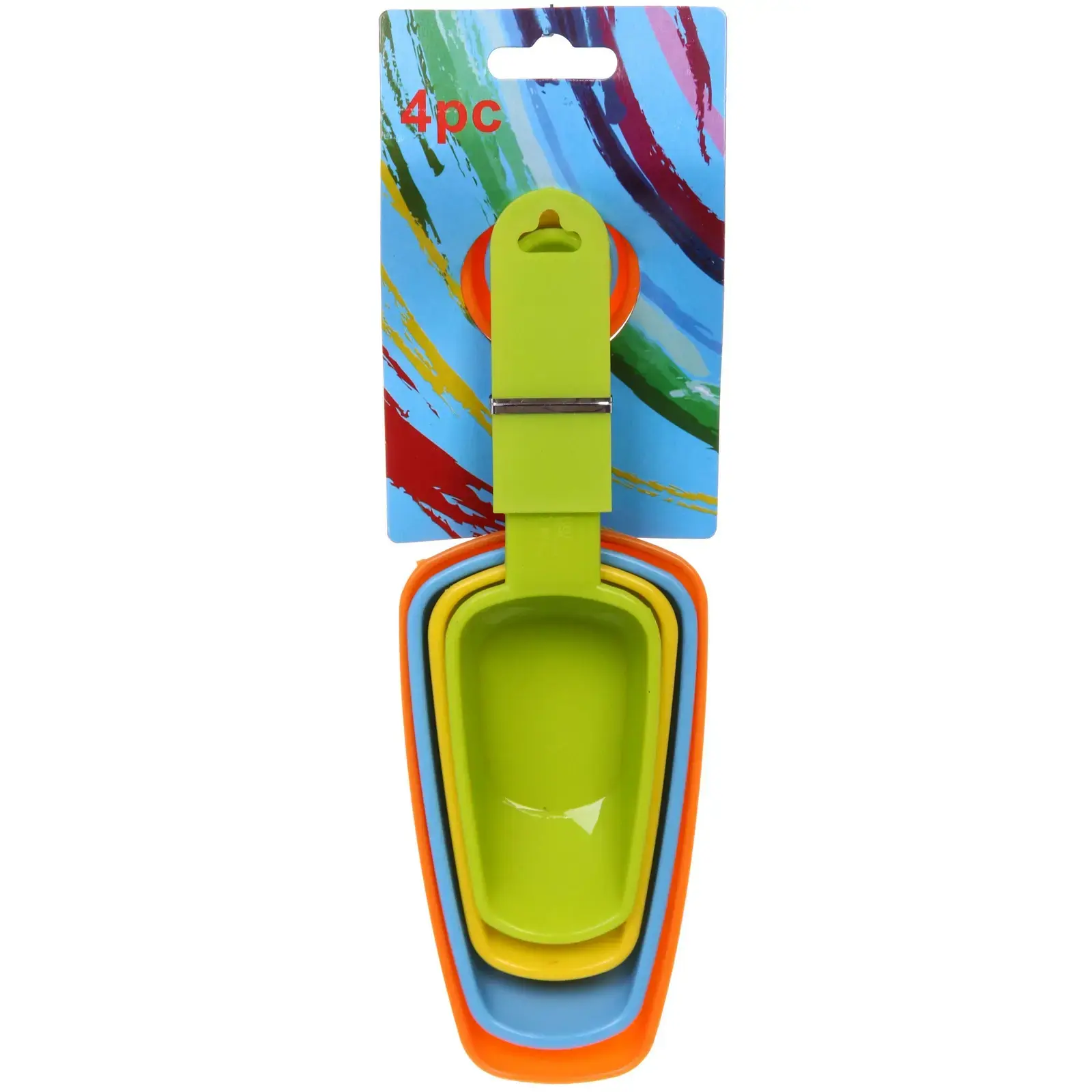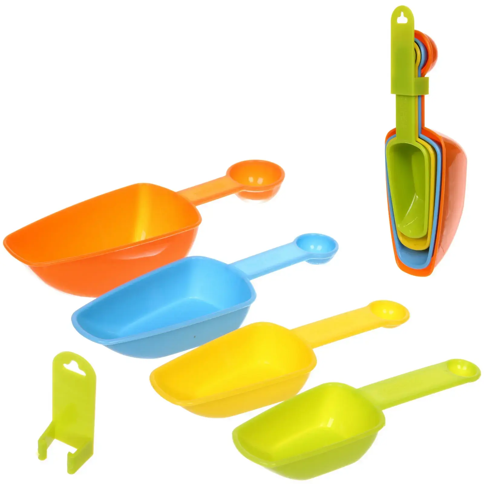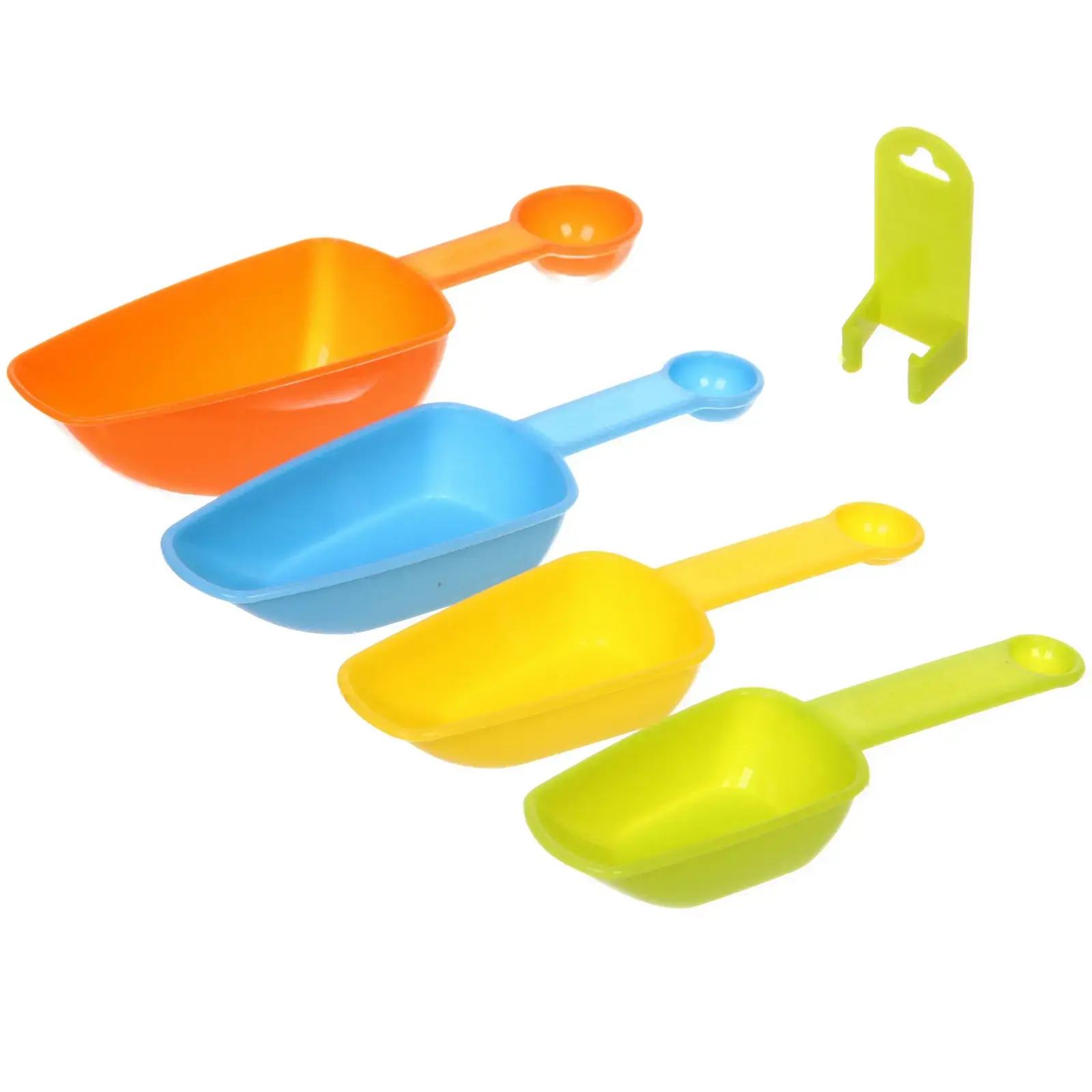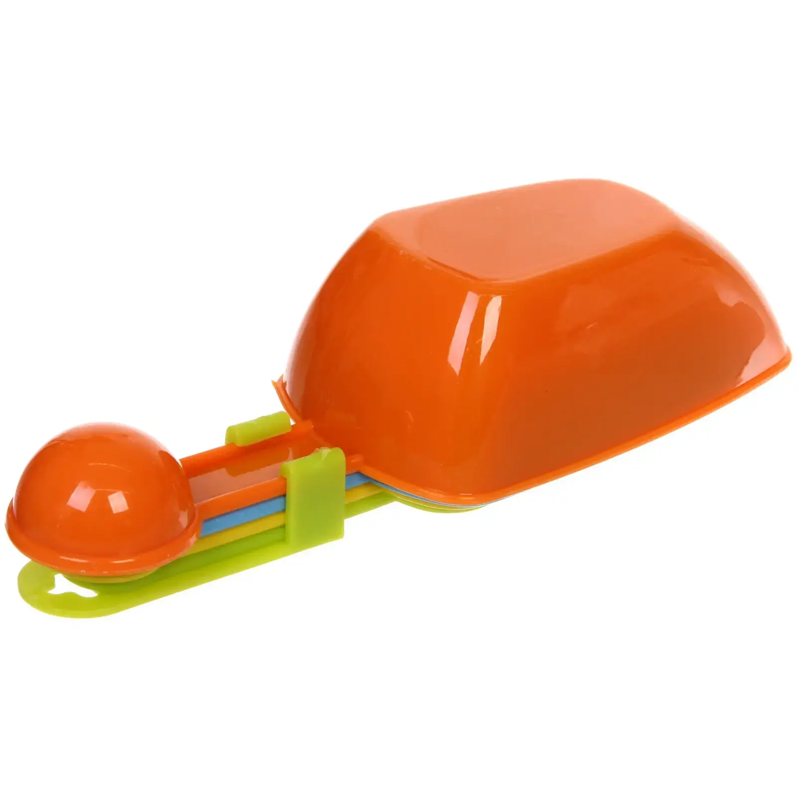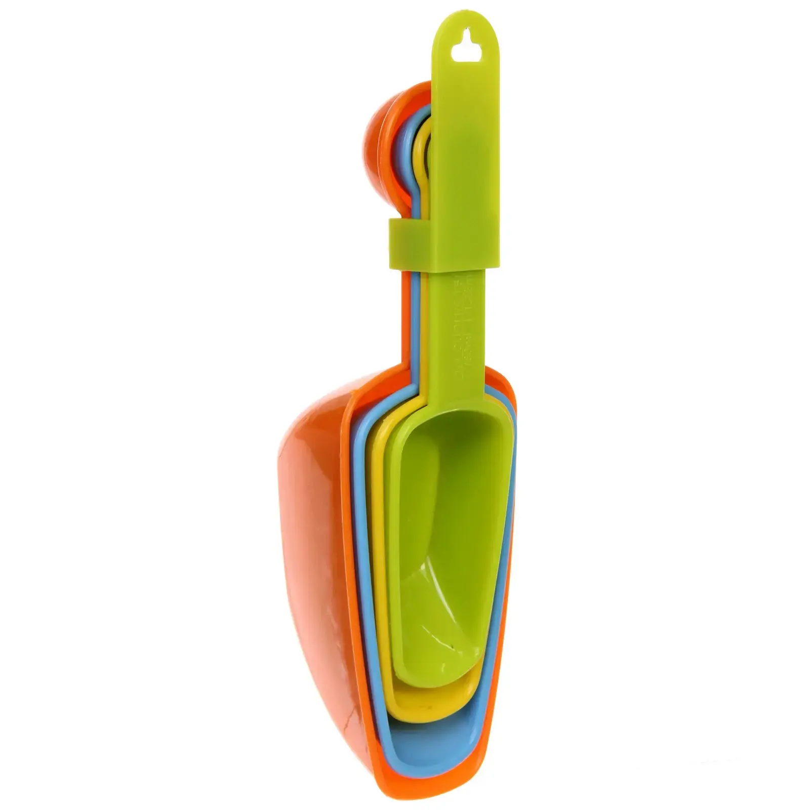 Совки легко вкладываются друг в друга, занимая минимум места. Яркие цвета (оранжевый, голубой, желтый, зеленый) создают позитивное настроение и помогают быстро найти нужный размер. Удобная подставка позволяет хранить комплект на рабочей поверхности или внутри кухонного шкафа.