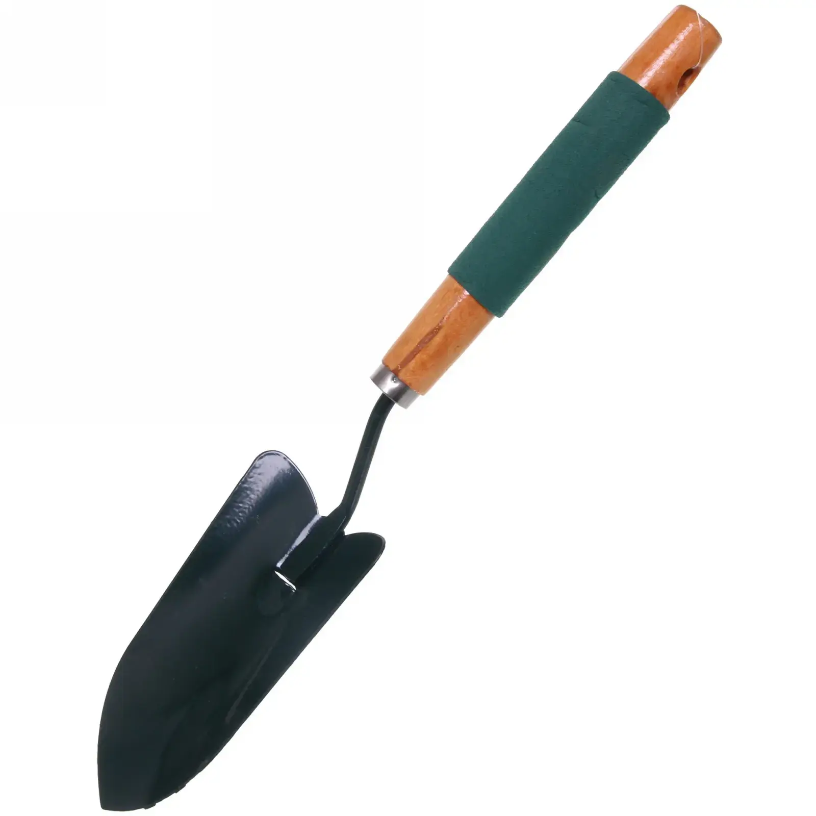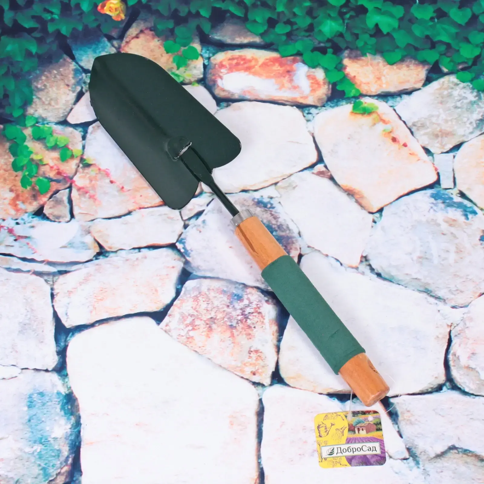 Совок выполнен из прочного металла и дерева, что обеспечивает надежность и долговечность. Его черная рабочая часть с закругленными краями позволяет легко вкапываться в почву, а деревянная ручка с резиновым покрытием обеспечивает комфортный захват. Этот инструмент станет незаменимым помощником в вашем саду!