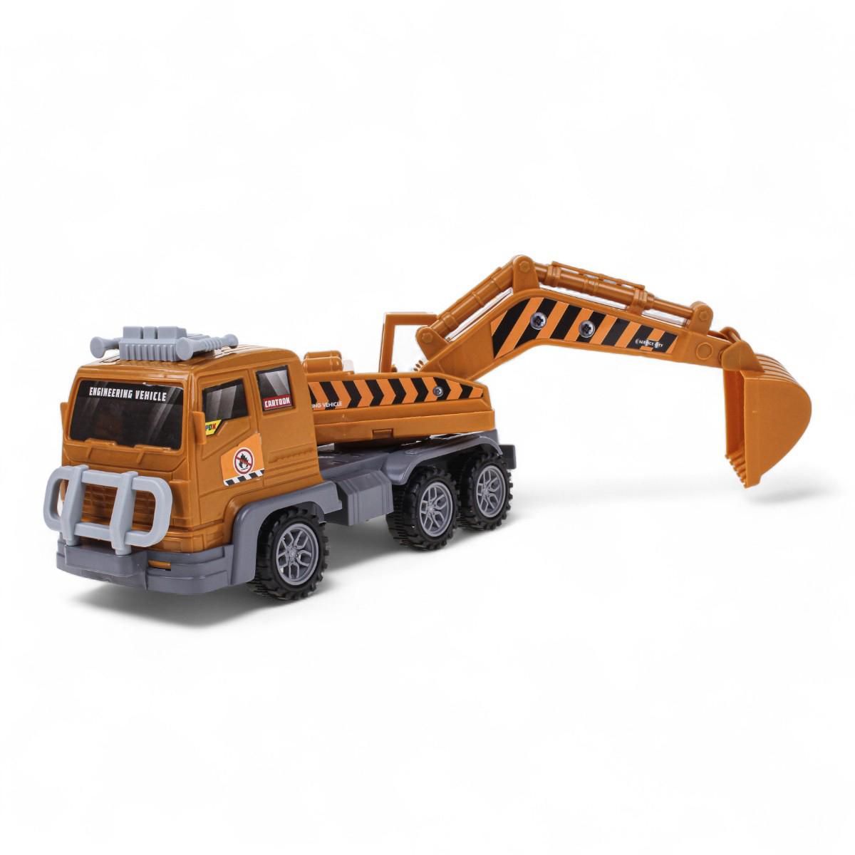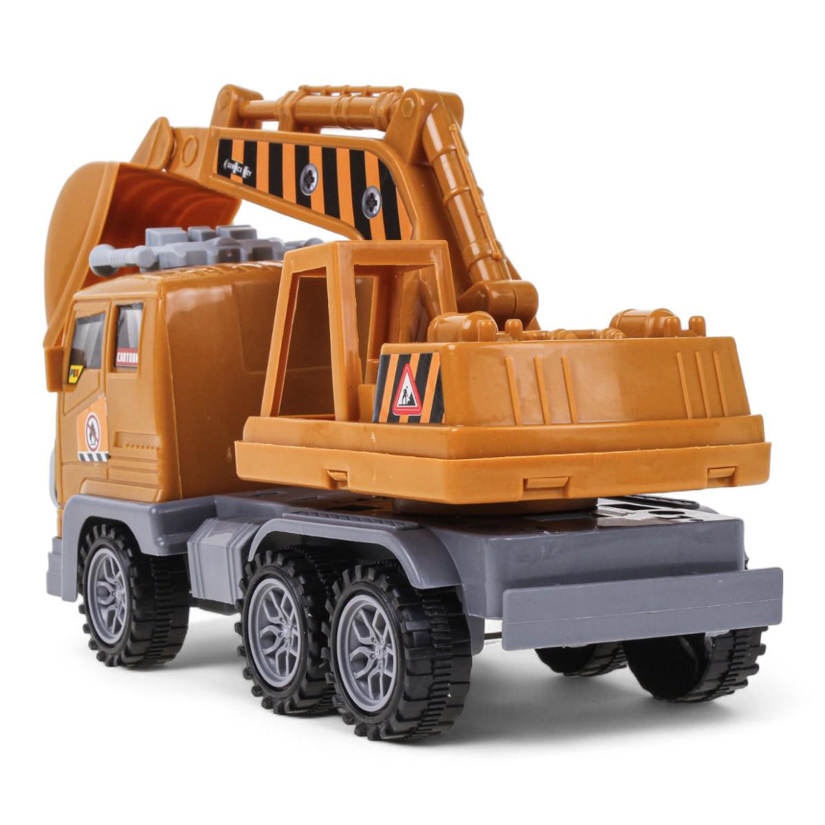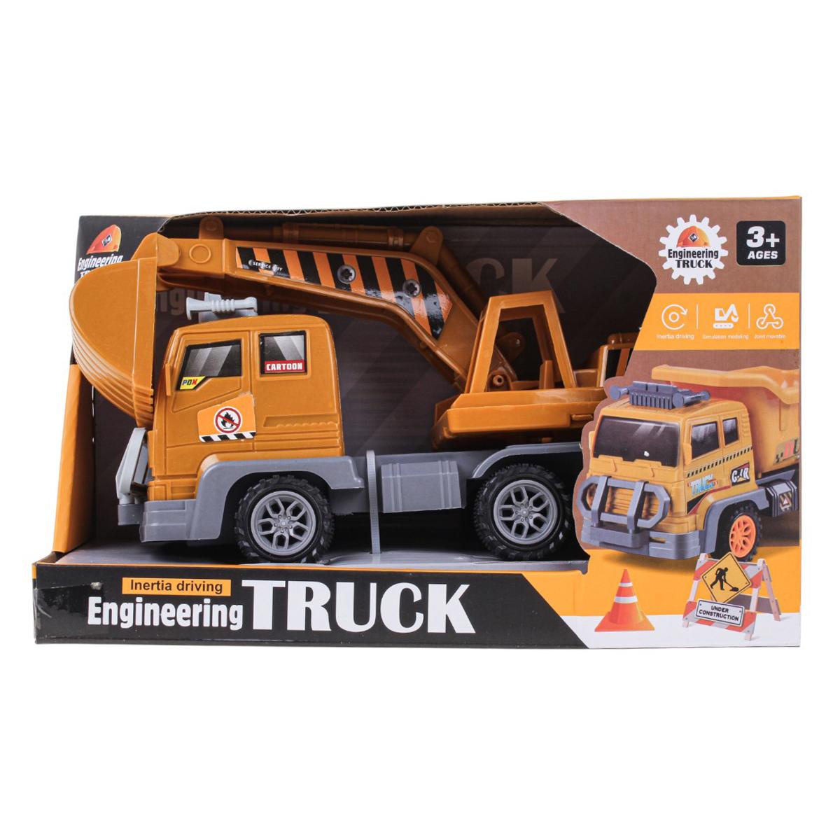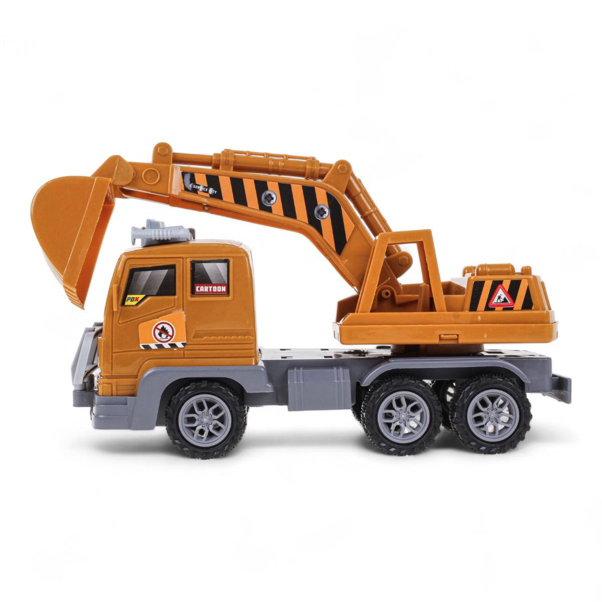 Машинка оснащена инерционным механизмом: достаточно прижать её к полу, откатить назад и отпустить — и она поедет вперёд сама. Экскаватор закреплён на платформе грузовика и имеет подвижный ковш, что позволяет проигрывать различные строительные и ремонтные сценарии.