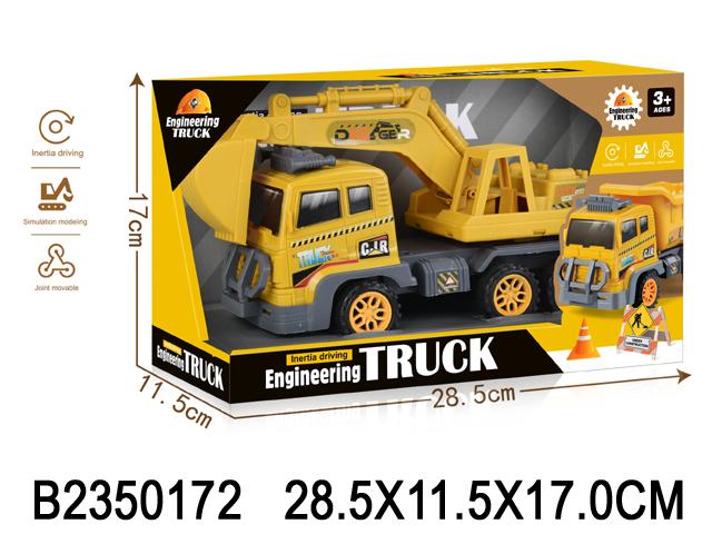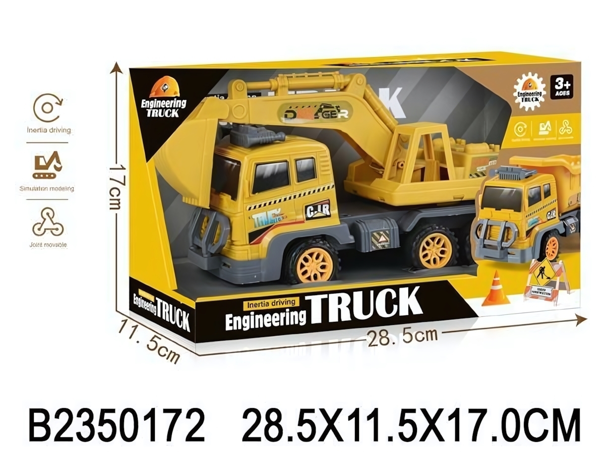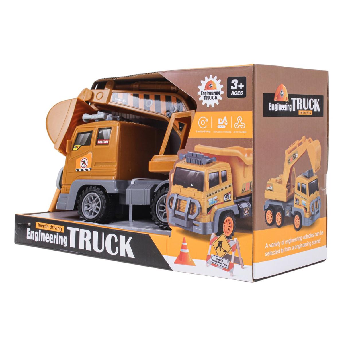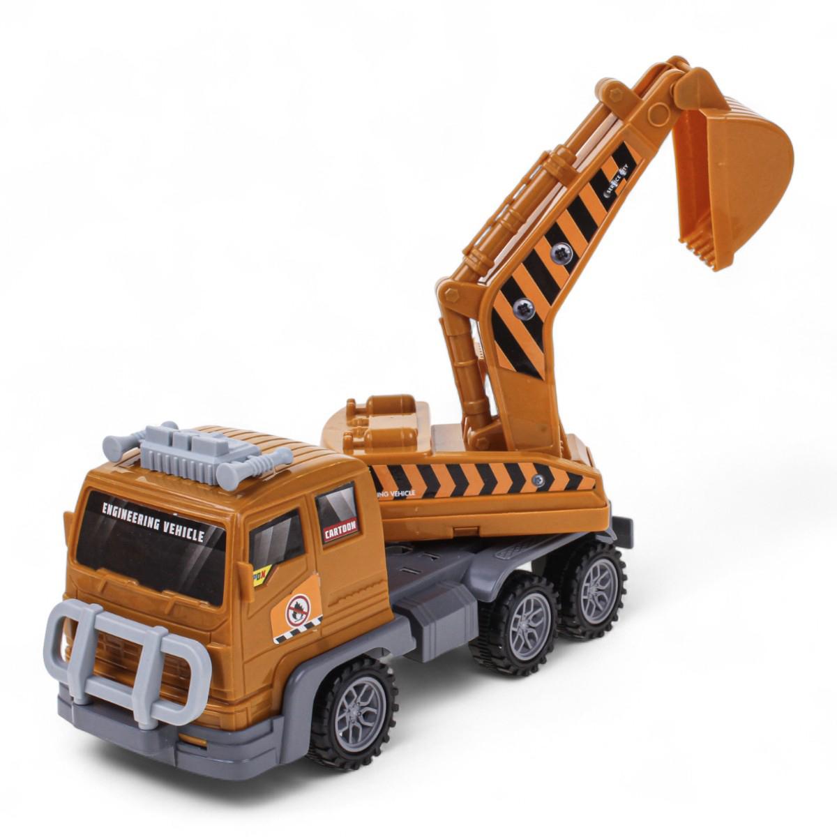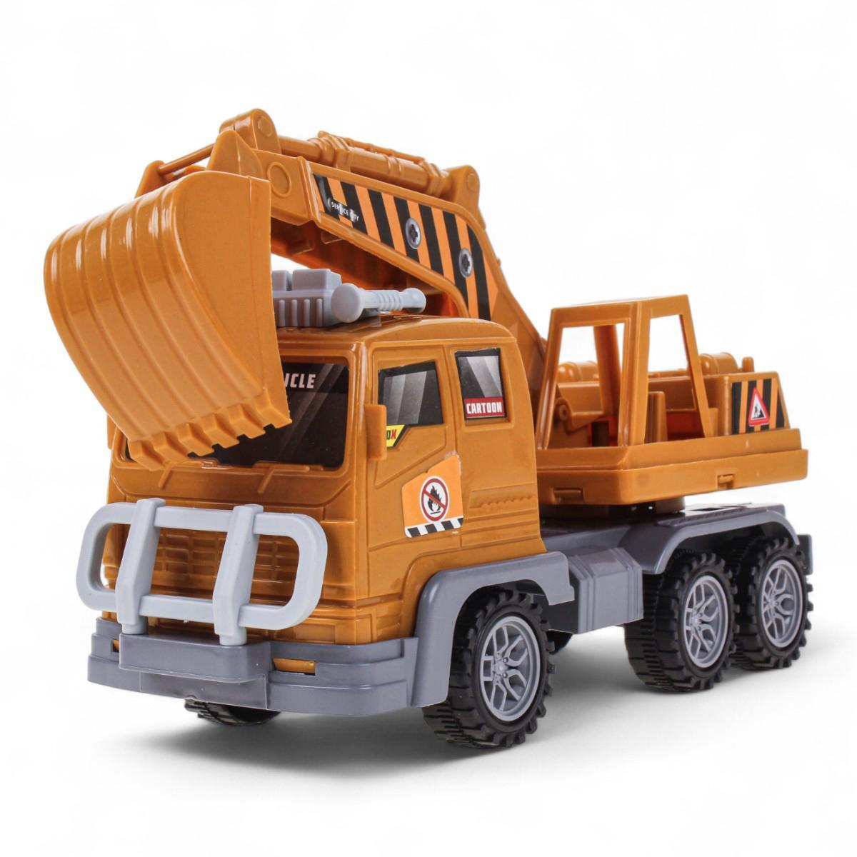 Машинка оснащена инерционным механизмом: достаточно прижать её к полу, откатить назад и отпустить — и она поедет вперёд сама. Экскаватор закреплён на платформе грузовика и имеет подвижный ковш, что позволяет проигрывать различные строительные и ремонтные сценарии.