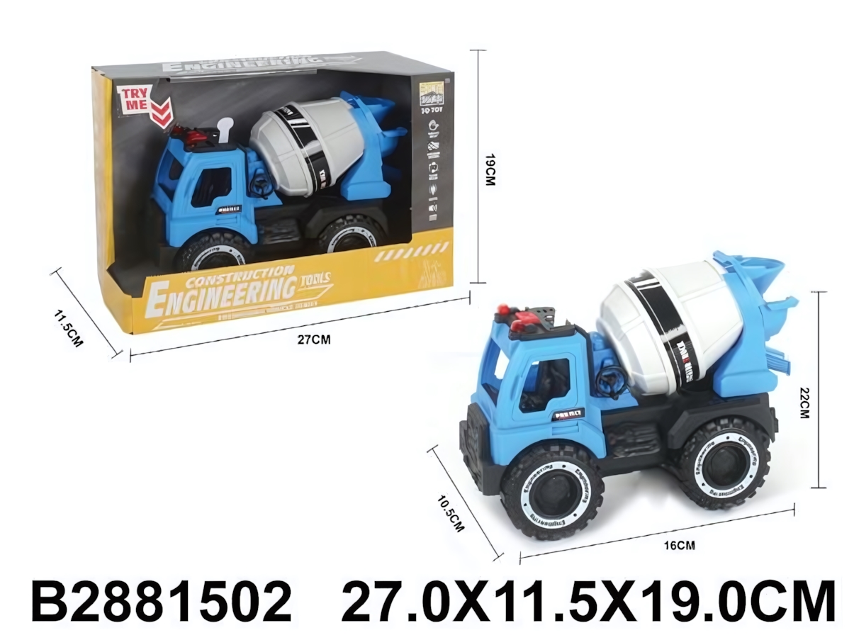 - Реалистичный дизайн: Игрушка детально проработана: узнаваемая форма бетономешалки с вращающимся барабаном, лоток для выгрузки смеси, кабина с окнами и рулём, крупные колёса с протекторами. Голубой, чёрный и серый цвета соответствуют настоящей строительной технике.