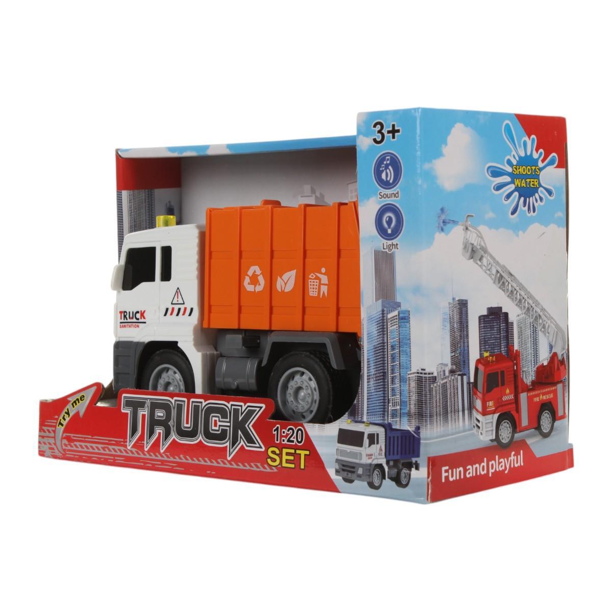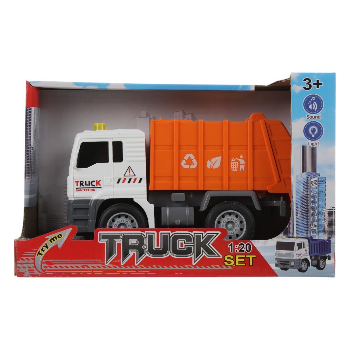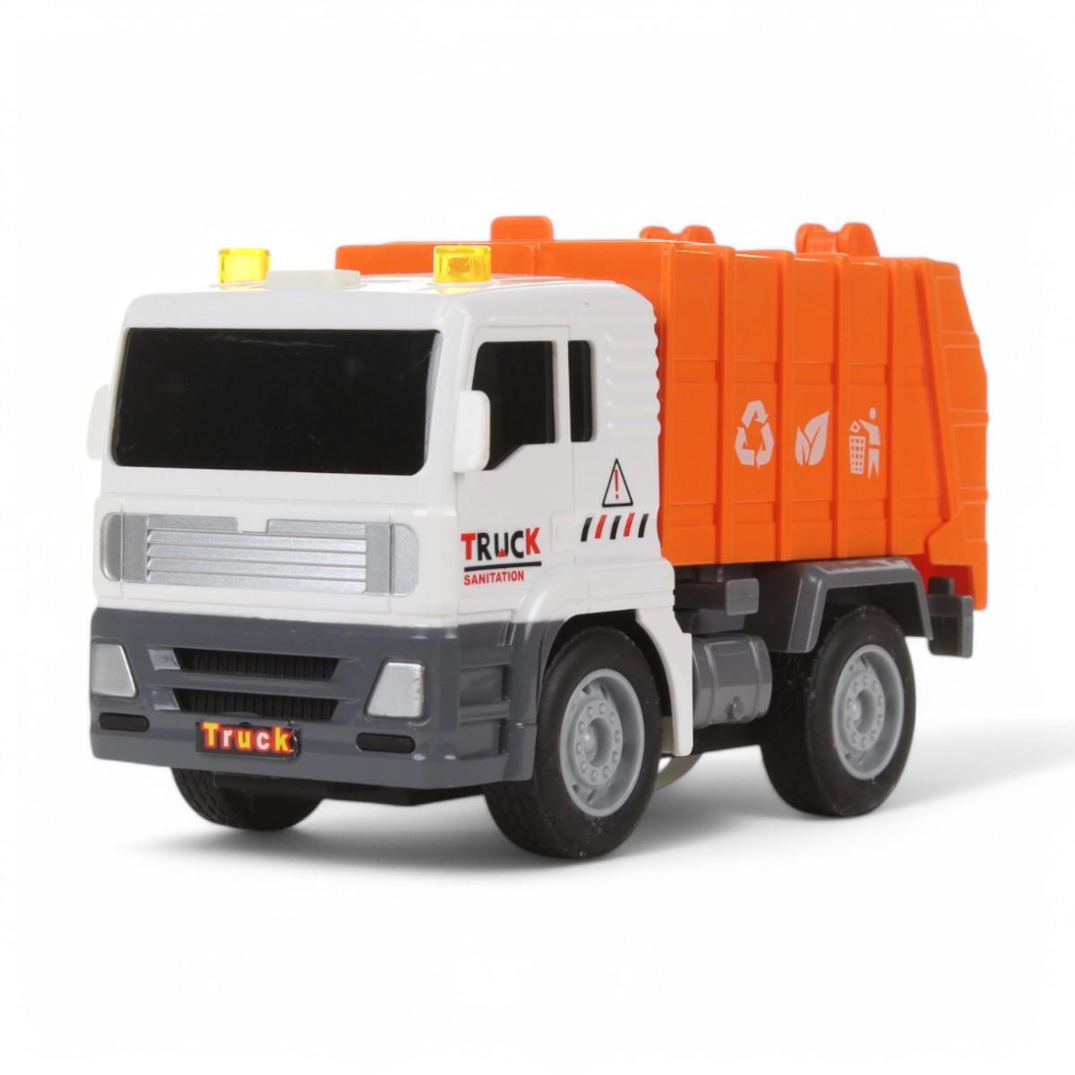 Детский грузовик изготовлен из безопасного пластика, обладает реалистичным дизайном с символами переработки и источниками света, стимулируя любопытство и социальную ответственность у ребенка.