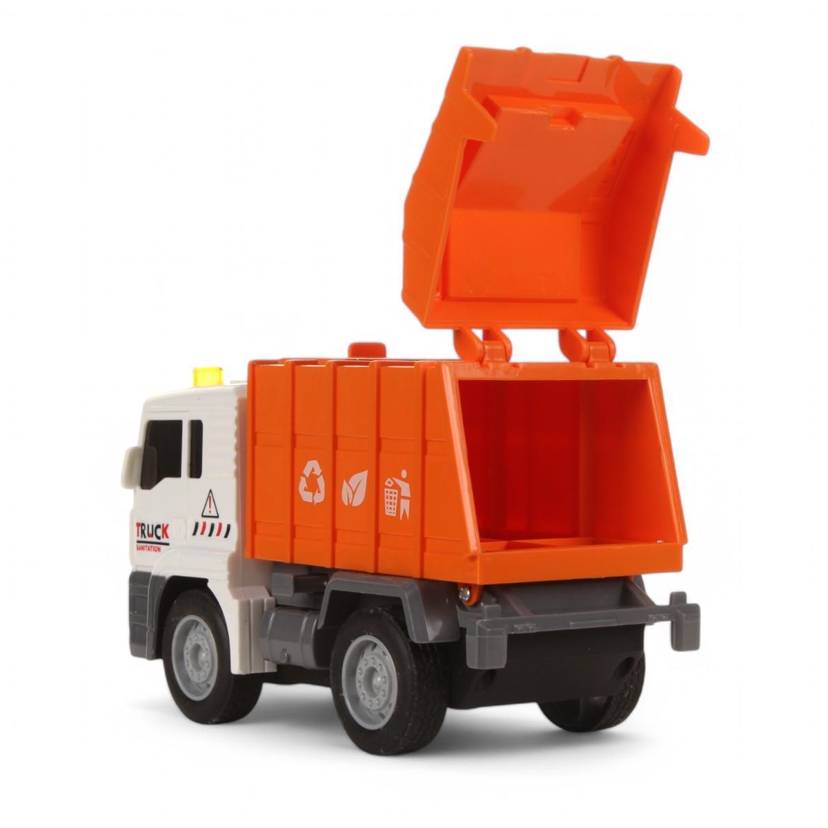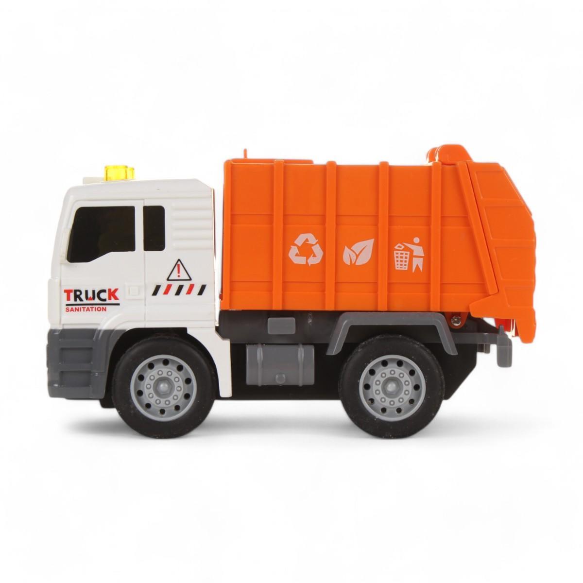 Игрушка активируется звуковыми и световыми эффектами, имитирующими работу мусоровоза. Она подходит для игры дома, в песочнице или на улице, развивая воображение и навыки моторики.