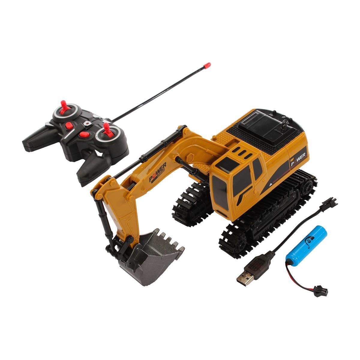 Экскаватор работает от встроенного аккумулятора, который заряжается через USB-кабель (входит в комплект). Управление осуществляется с помощью удобного пульта с двумя джойстиками.