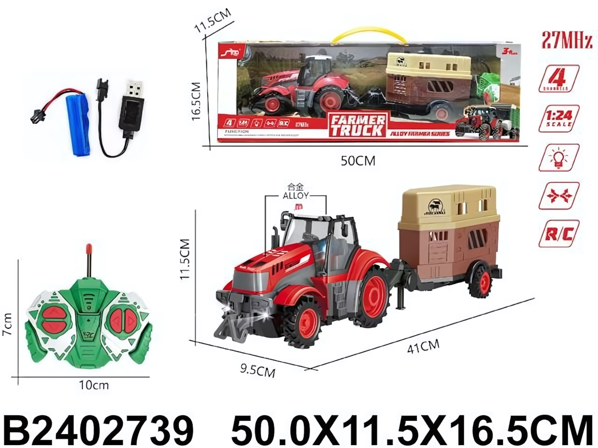 Длина трактора с прицепом — около 41 см. Масштаб модели — 1:24. Материал — пластик. В комплект входит аккумулятор и USB-кабель для зарядки. Рекомендовано для детей от 3 лет. Трактор станет отличным подарком для любителей спецтехники и радиоуправляемых моделей.