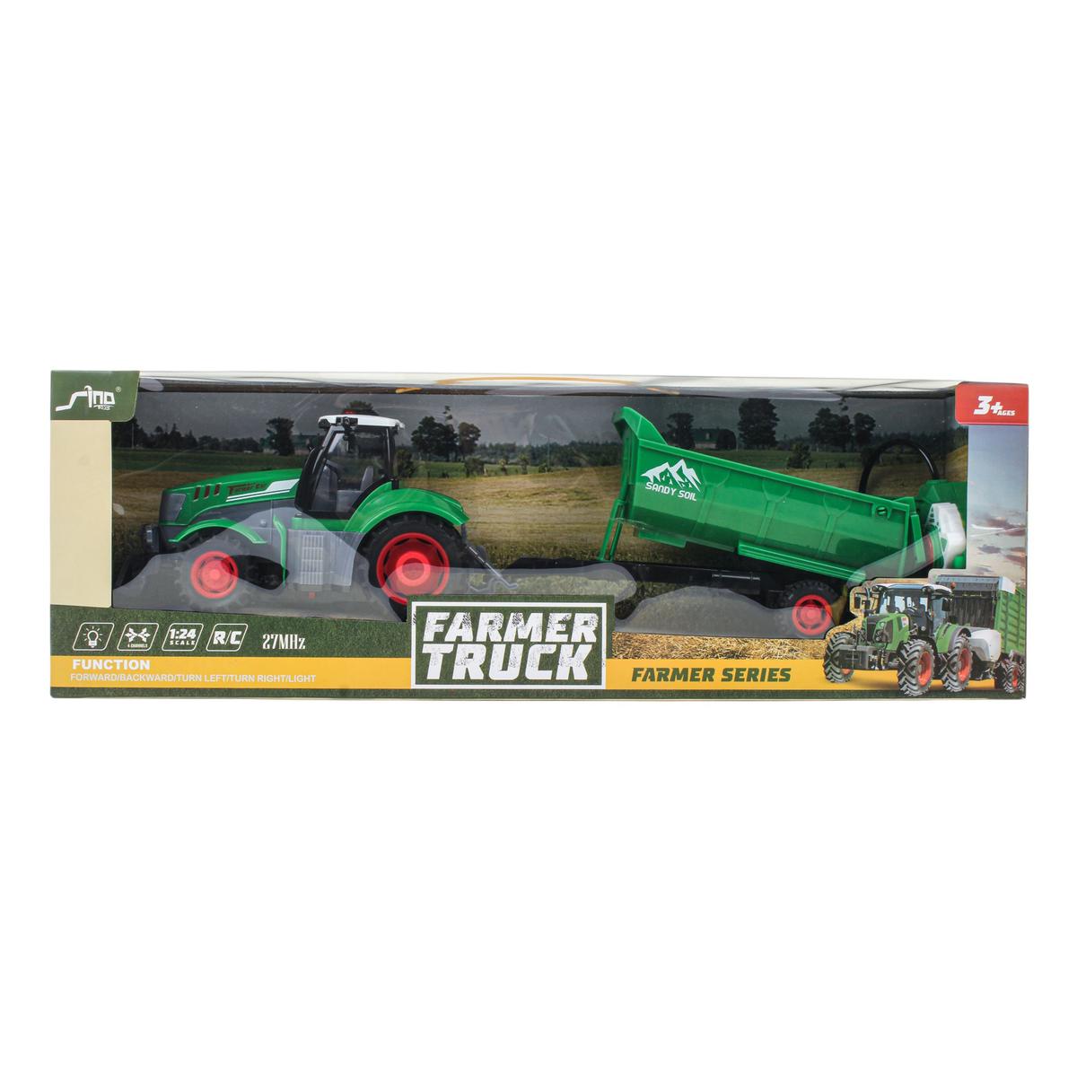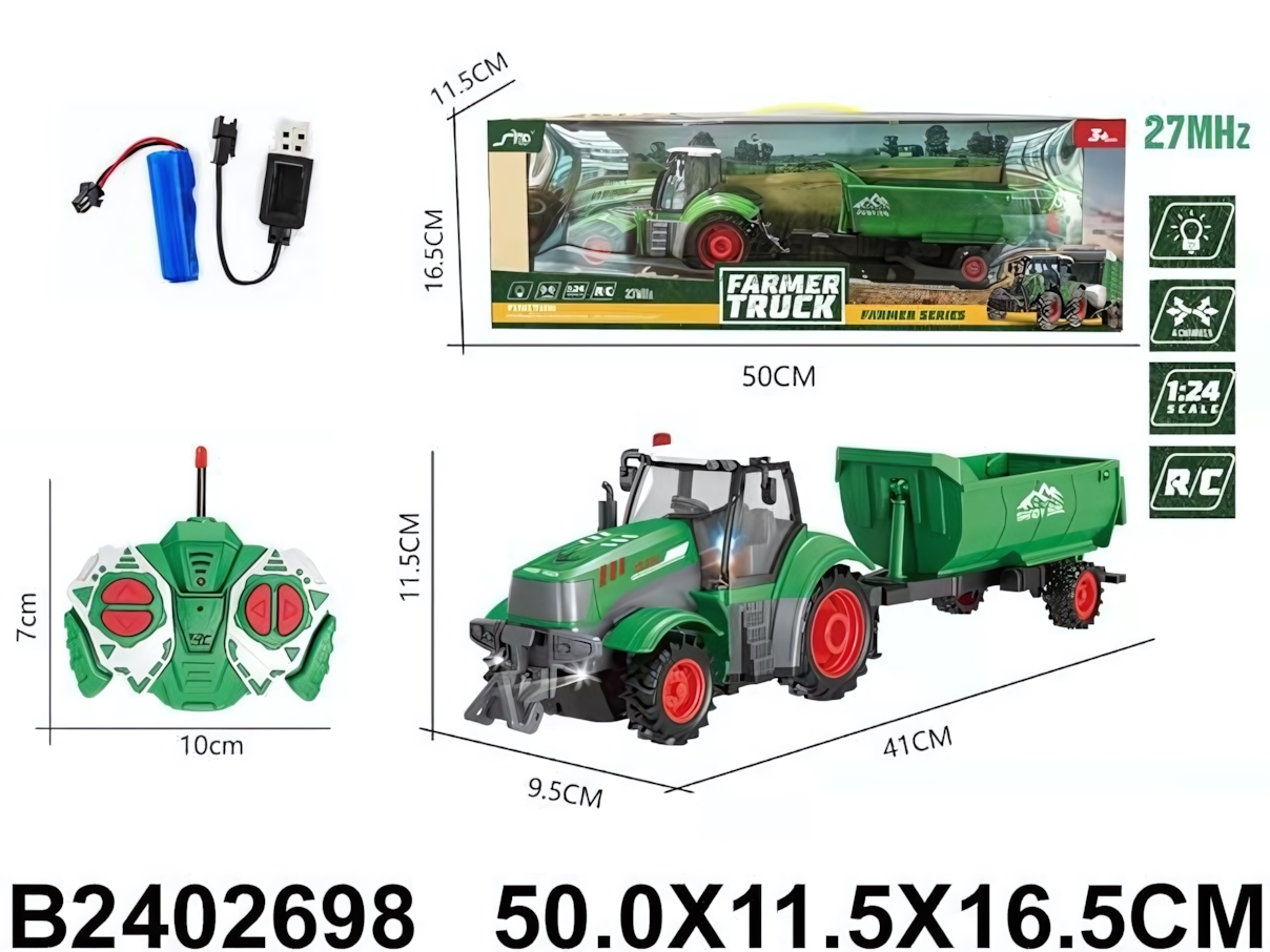 В набор входит трактор с прицепом, пульт управления, аккумулятор и USB-кабель для зарядки. Аккумуляторная батарея позволяет экономить на сменных элементах питания и быстро подзаряжать технику от любого USB-устройства. Общая длина трактора с прицепом составляет 41 см — оптимальный размер для активной игры дома.