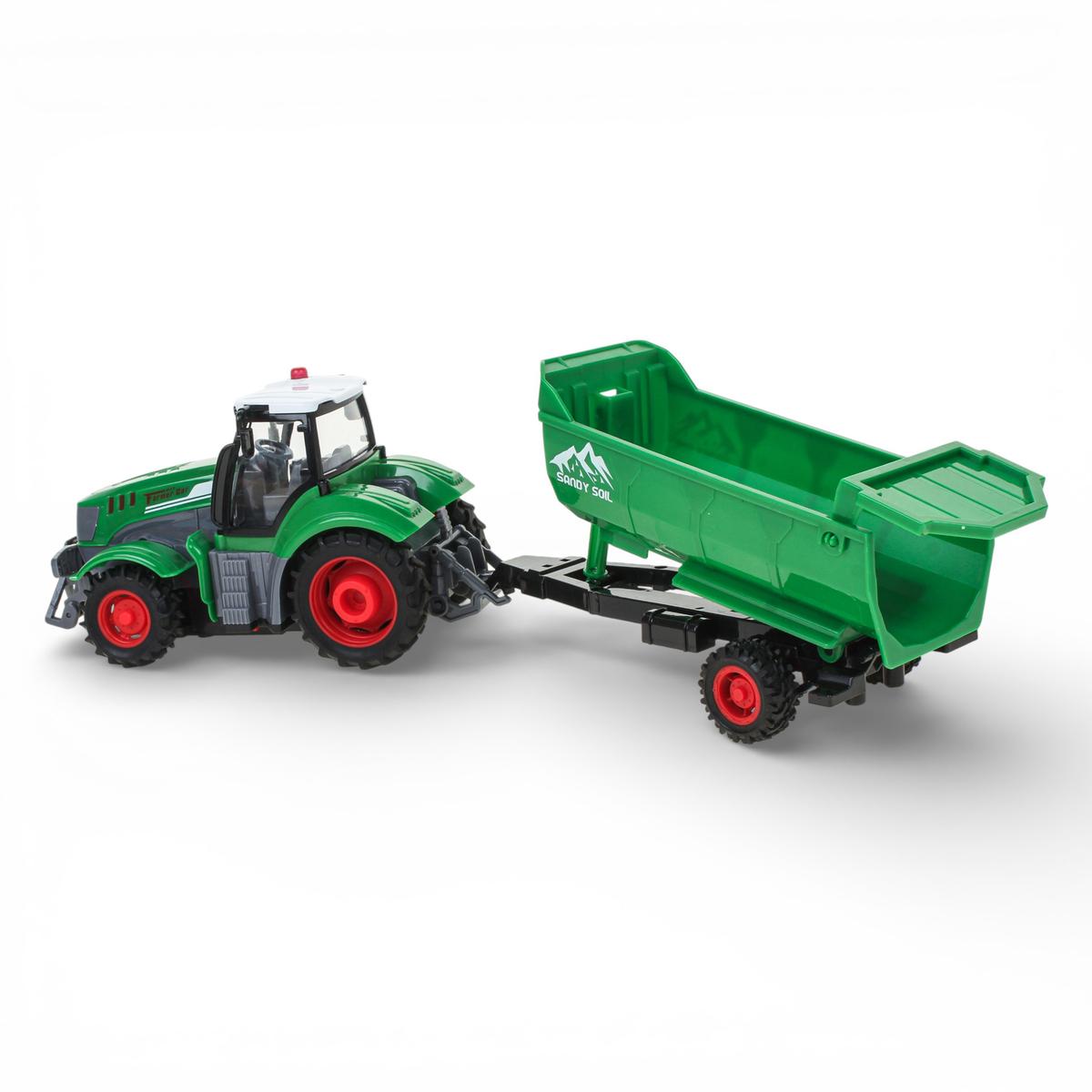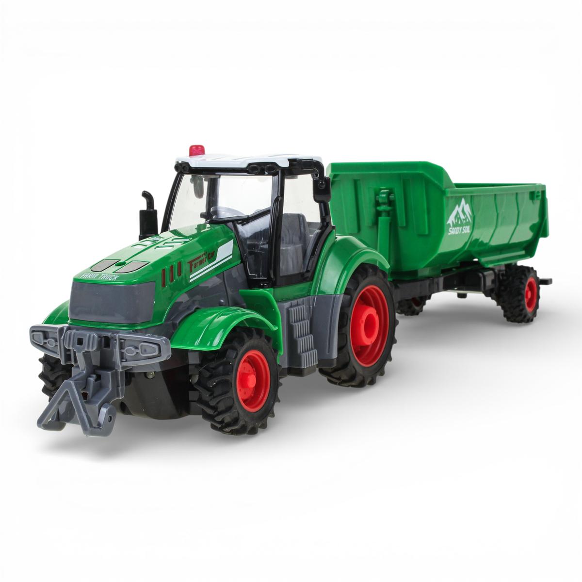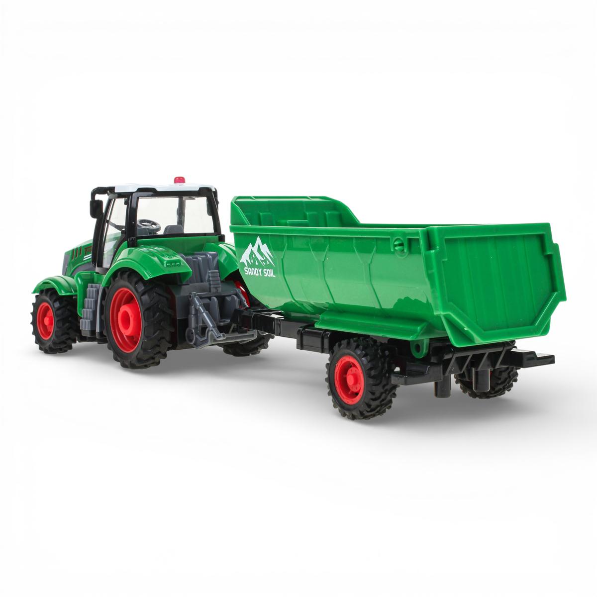 Модель выполнена из прочного пластика. Детализированный кузов, крупные колеса с выраженным протектором и контрастные элементы корпуса делают трактор визуально выразительным и устойчивым во время движения. Игрушка подходит для детей от 3 лет и станет отличным выбором для сюжетных игр, развития координации и воображения.