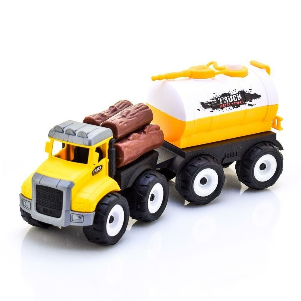 Яркие цвета (желтый, белый, оранжевый) и реалистичные детали делают игрушку привлекательной для детей. Прицеп с цистерной "TRUCK WATER TANK" добавляет реализма в игры.