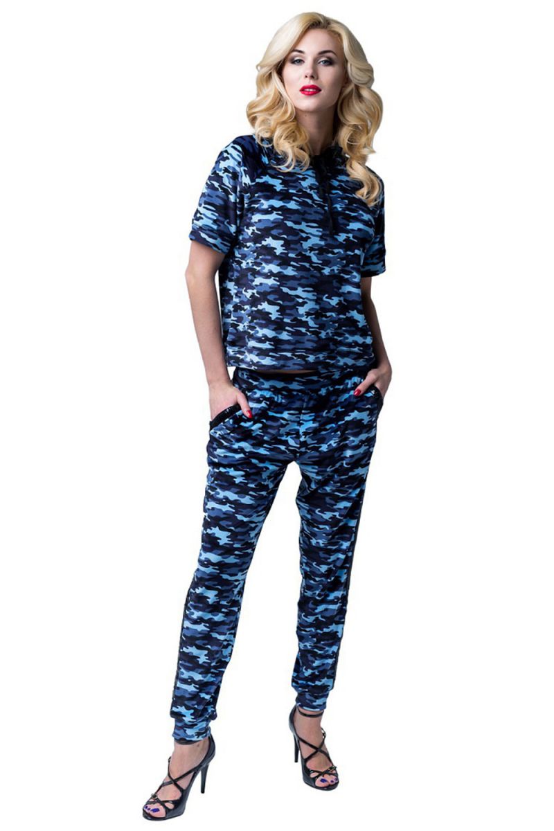 Костюм представлен в модном цвете «синий камуфляж», который отлично сочетается с базовыми цветами в гардеробе. Размер L подойдёт для стандартной фигуры. Для сохранения первоначального вида и яркости декоративных элементов рекомендуется бережная стирка при щадящем режиме.