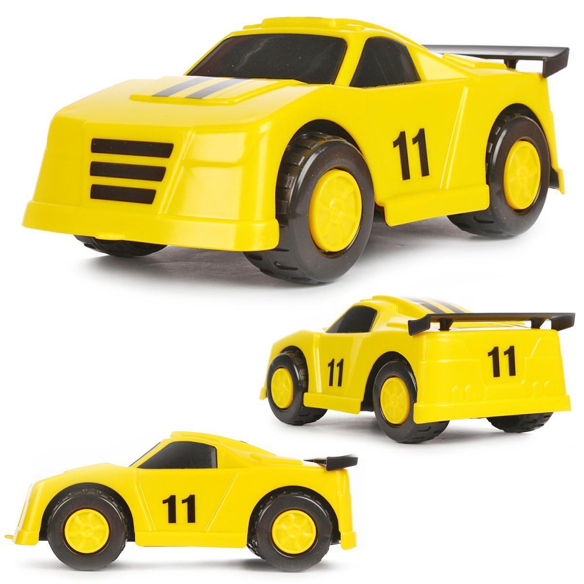 Машинка имеет характерные черные полосы на капоте и номер '11' на боковых сторонах, что придает ей спортивный вид. Задний спойлер и круглые черные колеса добавляют дополнительный шарм. Размеры игрушки не указаны, но она визуально относится к стандартным размерам для детских игрушек, что делает ее идеальной для маленьких гонщиков.