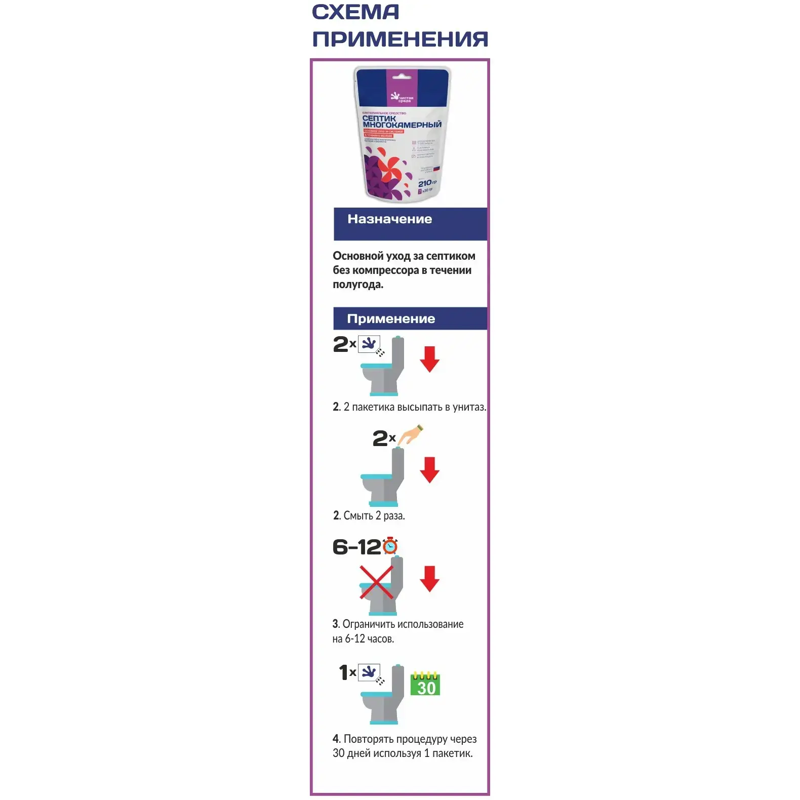 Применение «Септика многокамерного» очень простое. Для достижения наилучших результатов, достаточно использовать 2 пакетика, высыпая их в унитаз, и смыть дважды. Рекомендуется ограничить использование на 6-12 часов, а через 30 дней повторить процедуру, используя 1 пакетик. Это позволит поддерживать оптимальное состояние вашего септика без компрессора.