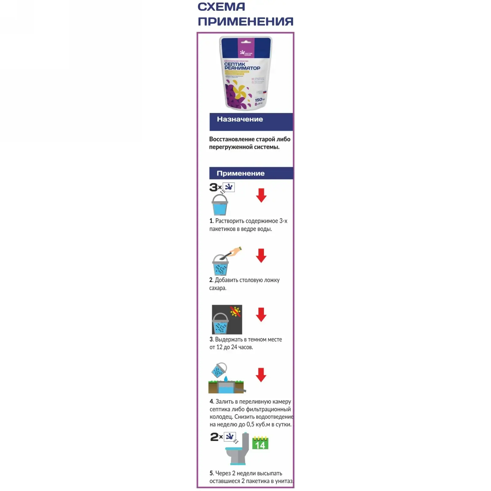 Препарат подходит для всех типов септиков и резервуаров объемом до 3000 литров. Для достижения наилучших результатов следуйте инструкции: