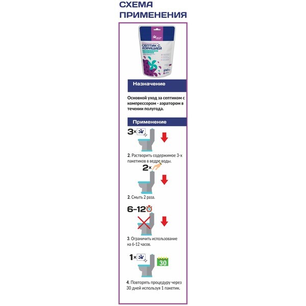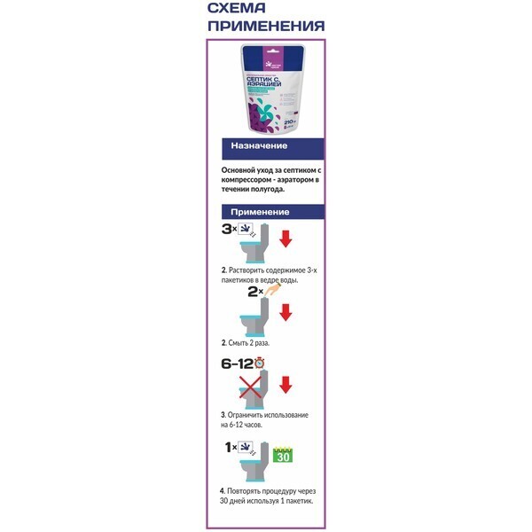 Препарат предназначен для основного ухода за септиками с компрессором. Для применения необходимо размешать содержание 3-х пакетов в ведре воды, затем смыть дважды. Ограничьте использование на 6-12 часов и повторяйте процедуру каждые 30 дней, используя один пакет. Это простое и эффективное решение для поддержания работы вашего септика.