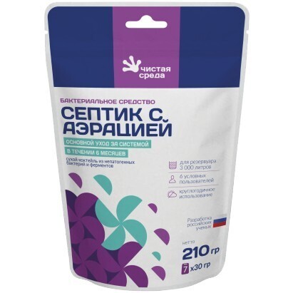 Средство бактериальное «Септик с аэрацией» — это ваш надежный помощник в поддержании чистоты и свежести в системе септиков. Устранение неприятных запахов и разложение органических отходов — главные преимущества этого продукта. Созданное российскими учеными, средство содержит высокую концентрацию (2Х10⁹ КОЕ) 5 видов спор аэро и анаэробных бактерий, что обеспечивает его эффективность и безопасность.