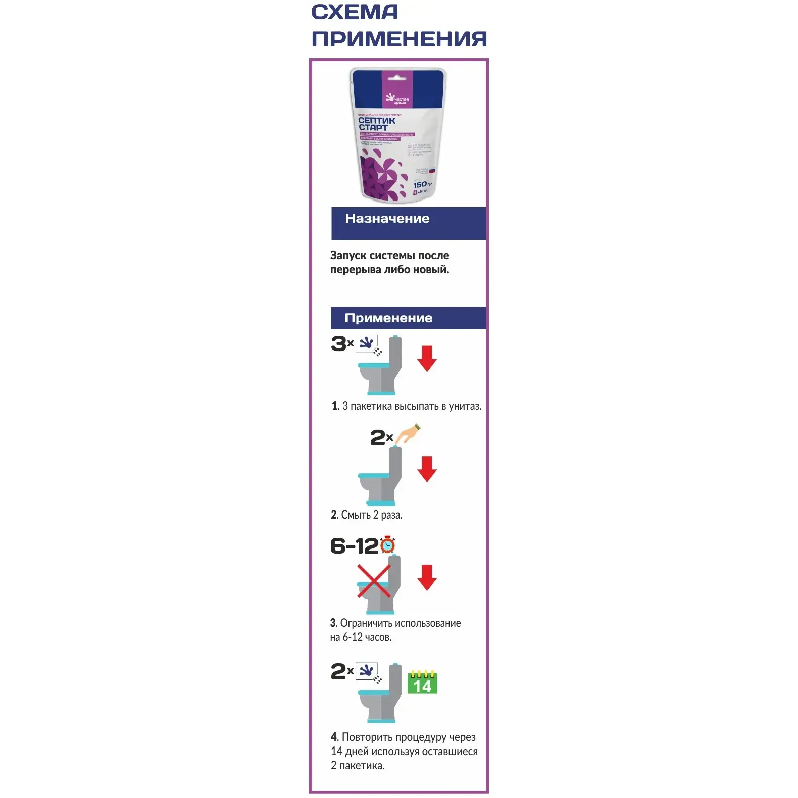 Объем упаковки составляет 150 г, что достаточно для нескольких применений. Упаковка выполнена в белом цвете с фиолетовыми и синими элементами, что делает ее заметной и привлекательной. «Септик-Старт» — это надежное и эффективное решение для поддержания работы ваших септических систем в идеальном состоянии.