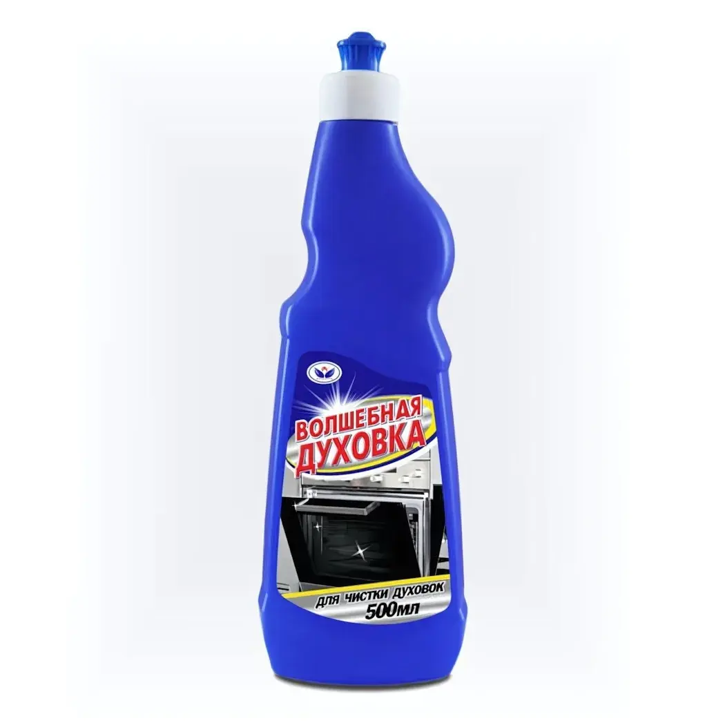 Объем бутылки составляет 500 мл, а ярко-синий цвет упаковки делает его заметным на полке. Этикетка содержит четкую информацию о назначении средства, что упрощает выбор. 'Волшебная духовка' — это ваш надежный помощник в поддержании чистоты на кухне, который поможет вам сэкономить время и силы.