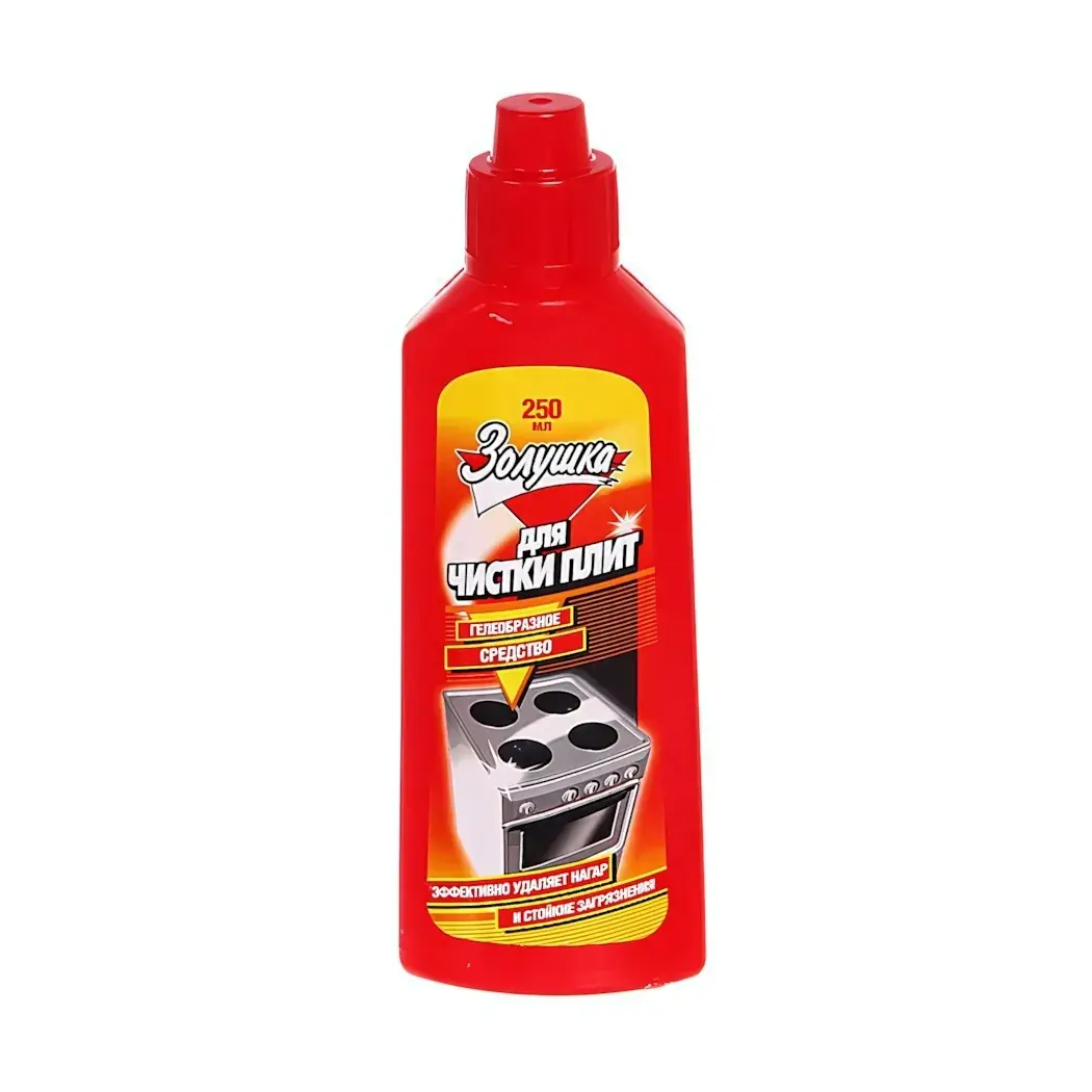 Просто нанесите небольшое количество геля на загрязнённую поверхность плиты, оставьте на несколько минут для лучшего эффекта, а затем протрите влажной губкой или тряпкой. 'Золушка' подходит для всех типов плит, включая газовые и электрические, что делает его универсальным решением для любой кухни.