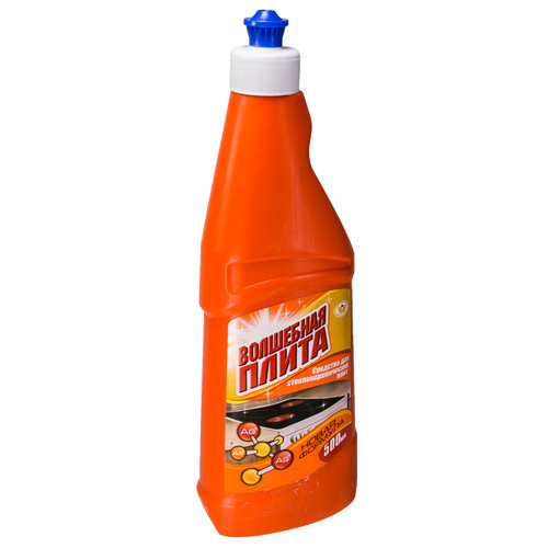 Упаковка средства выполнена в ярком оранжевом цвете с белой верхней частью и синей крышкой, что делает его заметным на кухонной полке. Уникальный дизайн упаковки включает изображения молекул и блестящих капель, подчеркивающих действие средства. 'Волшебная плита' — это ваш надежный помощник в поддержании чистоты на кухне.