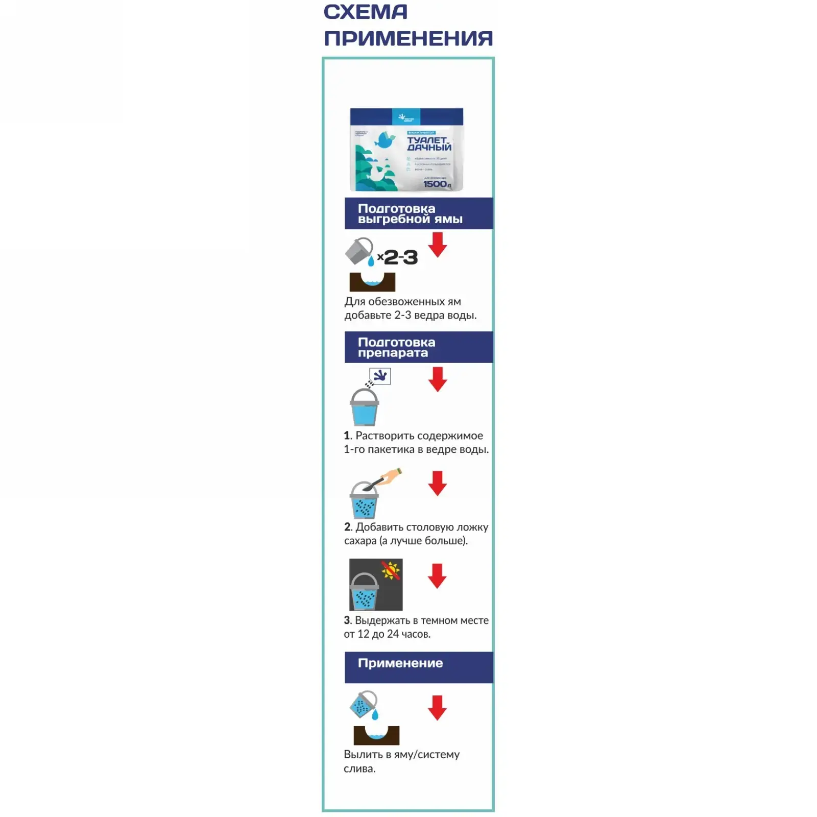 Упаковка содержит четкие инструкции по применению, включая этапы подготовки выгребной ямы и приготовления раствора. Для достижения наилучших результатов рекомендуется добавлять столовую ложку сахара в раствор. Не забывайте, что препарат не совместим с кислотами и щелочами, поэтому избегайте использования с другими чистящими средствами, которые могут снизить его эффективность.