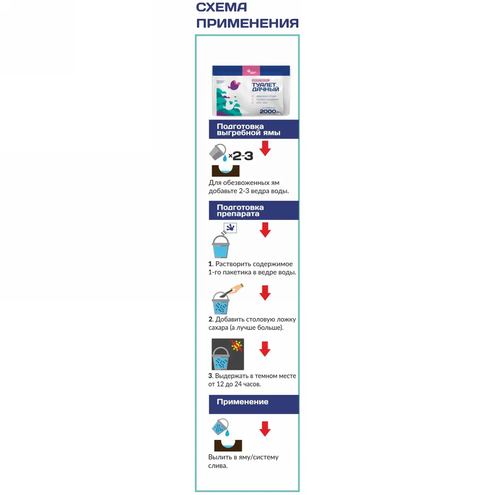 Объем упаковки составляет 2000 литров, что позволяет использовать его для нескольких сезонов. Препарат разработан и произведен в России, что гарантирует высокое качество и надежность. Не упустите возможность сделать ваш дачный туалет чистым и комфортным!