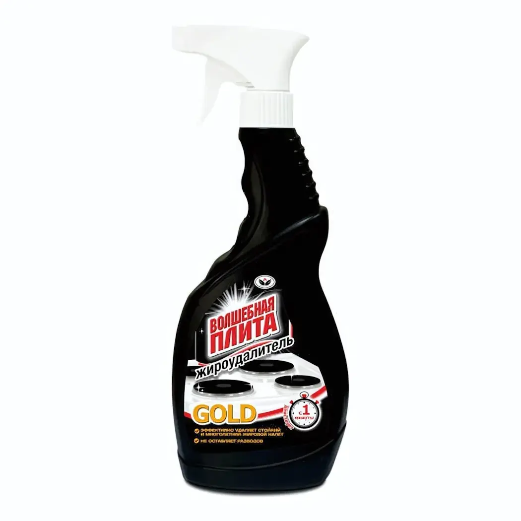 Представляем вам жироудалитель GOLD от 'Волшебная плита' — идеальное решение для быстрой и качественной уборки на кухне. Это средство эффективно удаляет стойкие и застарелые загрязнения, не оставляя разводов, что делает его незаменимым помощником в каждом доме.