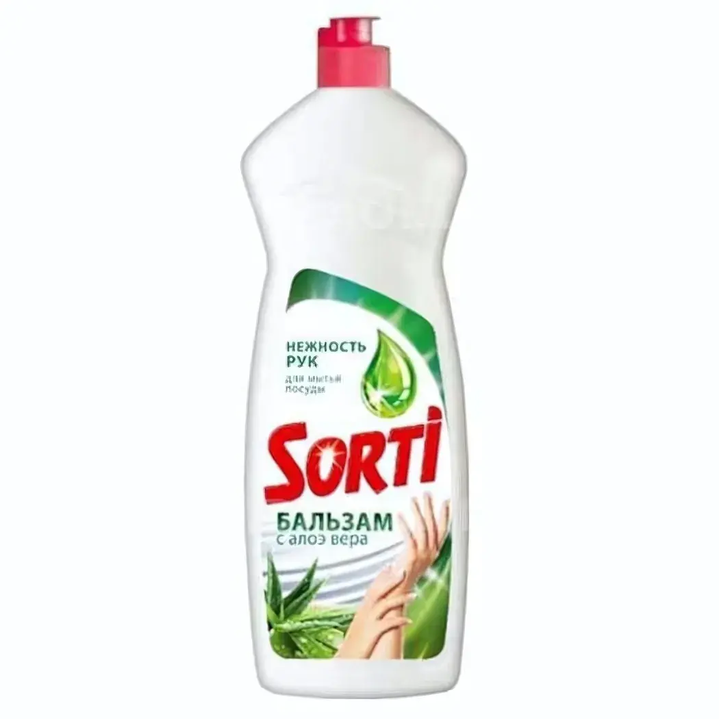 Объем бутылки составляет 900 г, что делает ее идеальным выбором для семьи. Упаковка оформлена с изображением рук, что подчеркивает мягкие свойства продукта. Не упустите возможность сделать мытье посуды более приятным и комфортным с SORTI!