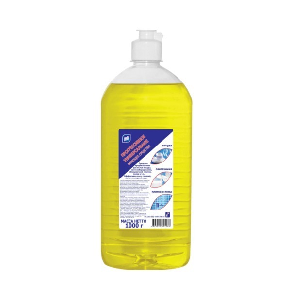 Бутылка имеет яркий желтый цвет и удобную круглую форму с прямыми гранями, что облегчает ее использование. На этикетке вы найдете инструкции по применению и область использования, а также графические элементы, иллюстрирующие процесс. Масса нетто составляет 1000 г, что делает это средство отличным выбором для тех, кто ценит качество и эффективность.