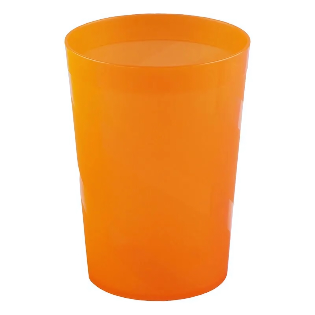 Стакан имеет классическую цилиндрическую форму с ровным верхним краем и плоским устойчивым дном. Объём в 250 миллилитров оптимален для сока, воды, морса или других холодных напитков. Изготовлен из качественного пластика, предназначенного для контакта с пищевыми продуктами. Цвет — насыщенный оранжевый, материал полупрозрачный.