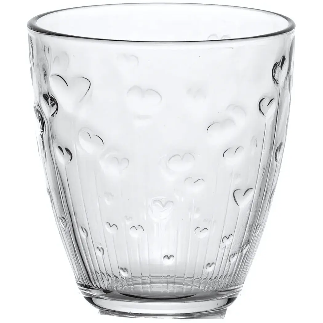 Этот стильный стакан объемом 290 мл станет отличным дополнением к вашей кухонной посуде. Его прозрачный цвет и рельефный дизайн с сердечками создают атмосферу уюта и комфорта, что делает его идеальным для сервировки напитков как в повседневной жизни, так и на праздниках.