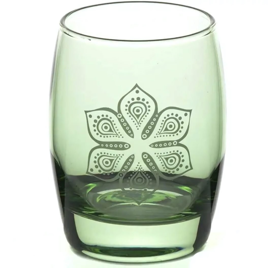 Уникальный узор в виде стилизованного цветка, нанесенный на зелёную стеклянную поверхность, придает стакану особую изысканность. Симметричная композиция узора, расположенная в центре, подчеркивает красоту и глубину цвета, создавая ощущение легкости и воздушности. Такой дизайн привнесет нотку природной гармонии в ваш интерьер.
