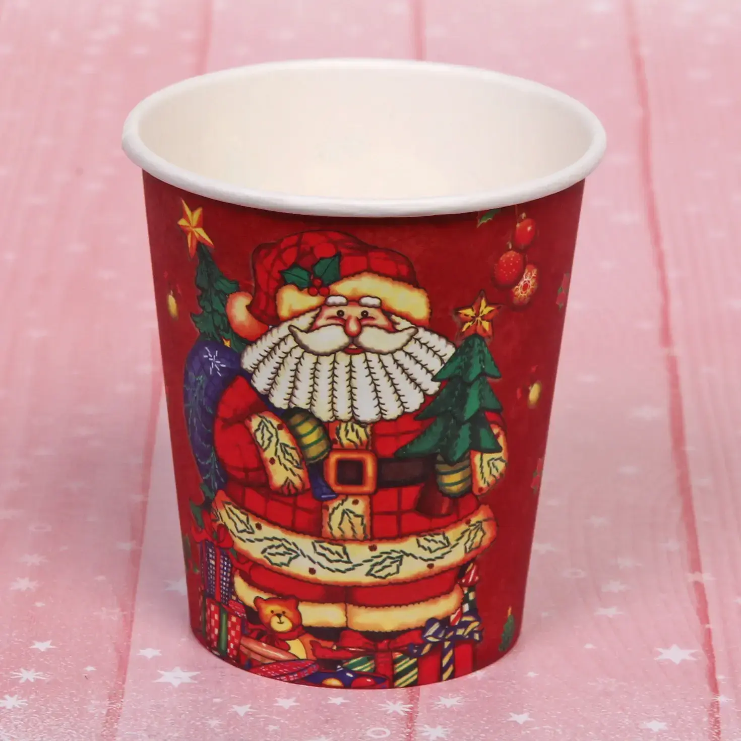 Каждый стаканчик украшен тематическим рисунком с Дедом Морозом, елками и подарками. Сделаны из прочной бумаги с защитным слоем, который предотвращает протекание.