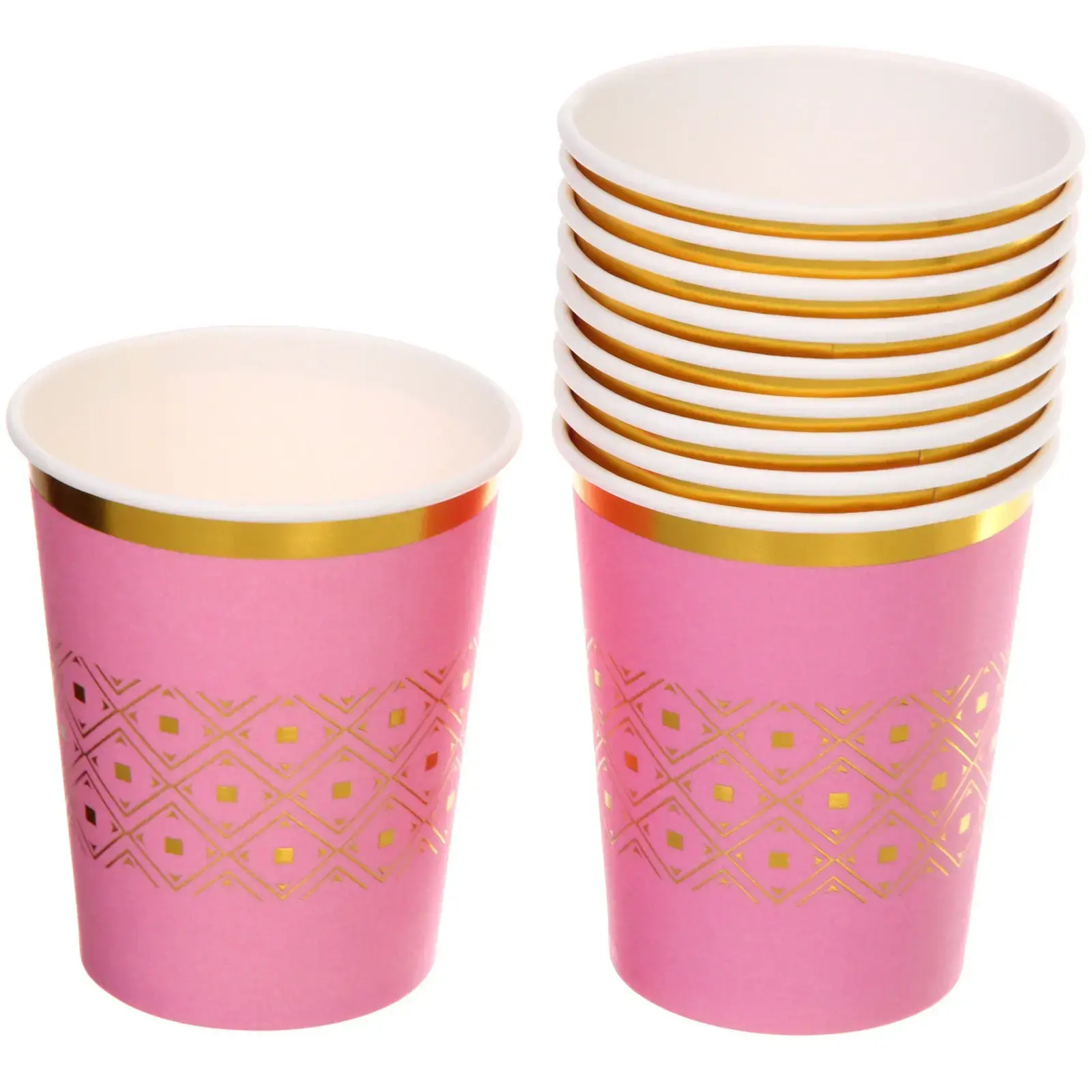 Создайте атмосферу уюта и стиля на вашем празднике с бумажными стаканами «Элегант». Эти стаканы не только красивы, но и практичны, что делает их отличным выбором для любых мероприятий. Розовый цвет с золотыми акцентами добавляет изысканности, а геометрический узор придаёт оригинальности. Каждый стакан объёмом 0,2 литра идеально подходит для подачи напитков, будь то сок, вода или коктейли.