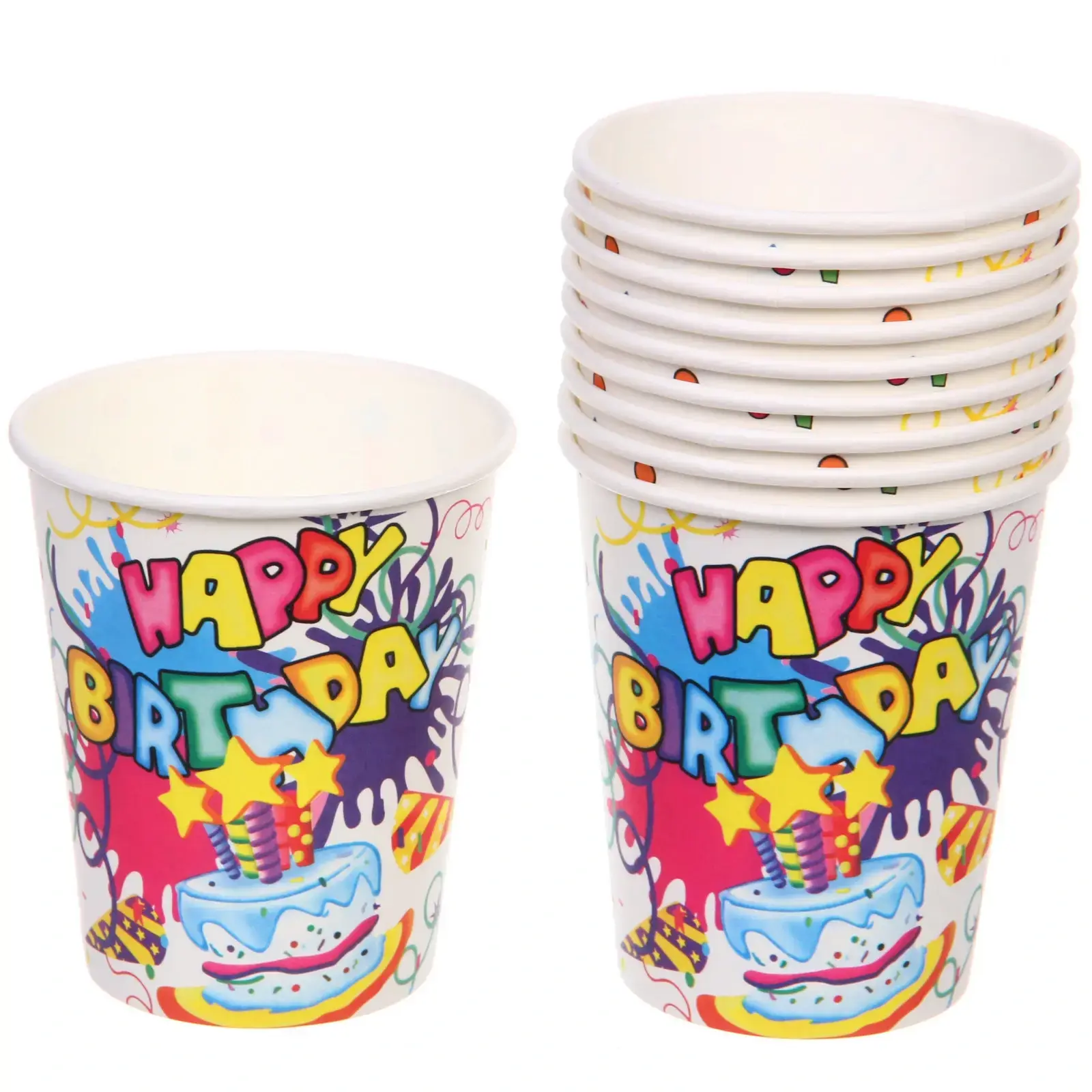 Создайте незабываемую атмосферу на вашем празднике с набором бумажных стаканчиков «HAPPY B-DAY!». Эти стаканчики идеально подходят для любых торжеств, добавляя яркие акценты к вашему столу. Каждый стаканчик украшен веселыми графическими элементами и надписью «HAPPY BIRTHDAY», что делает их отличным выбором для детских и взрослых праздников.