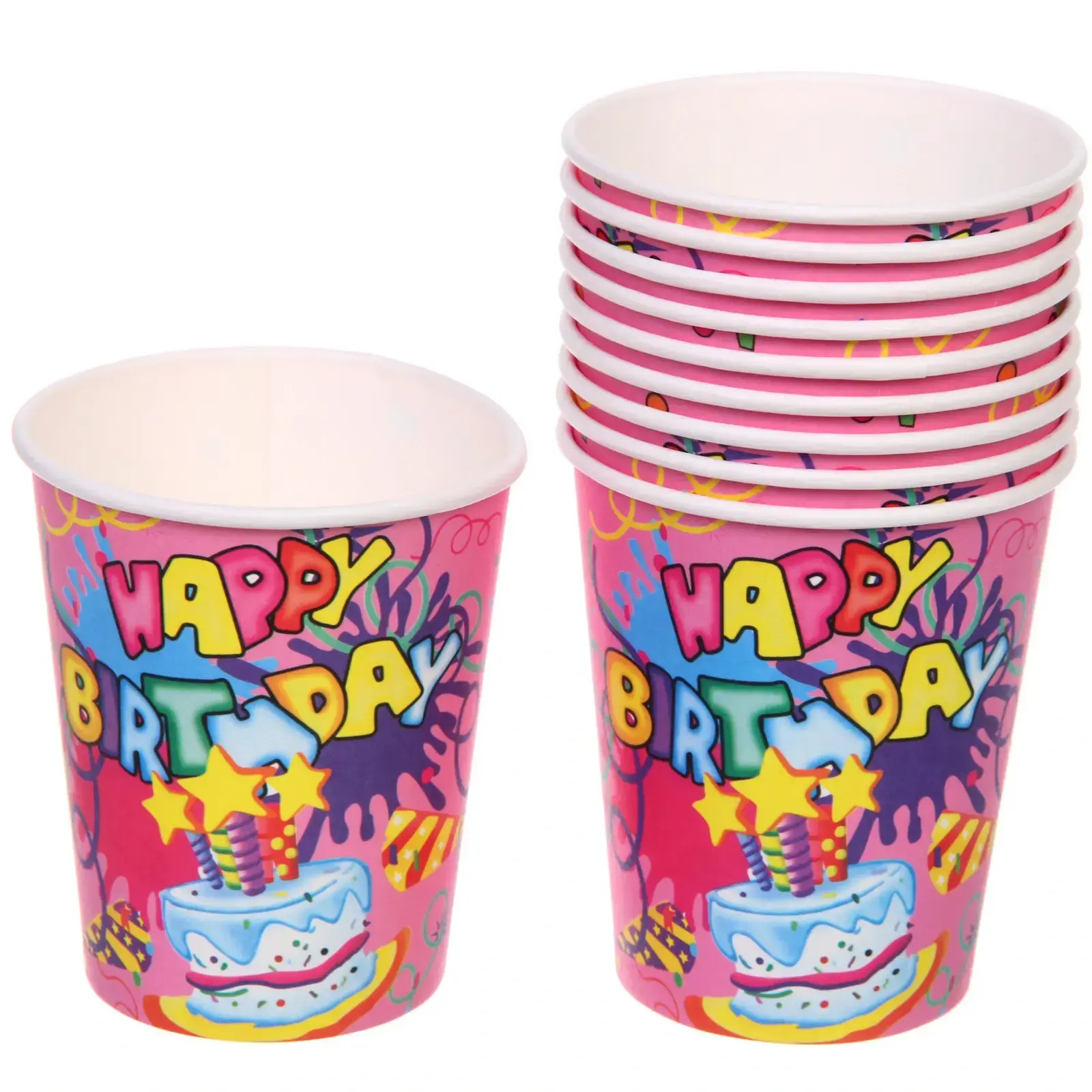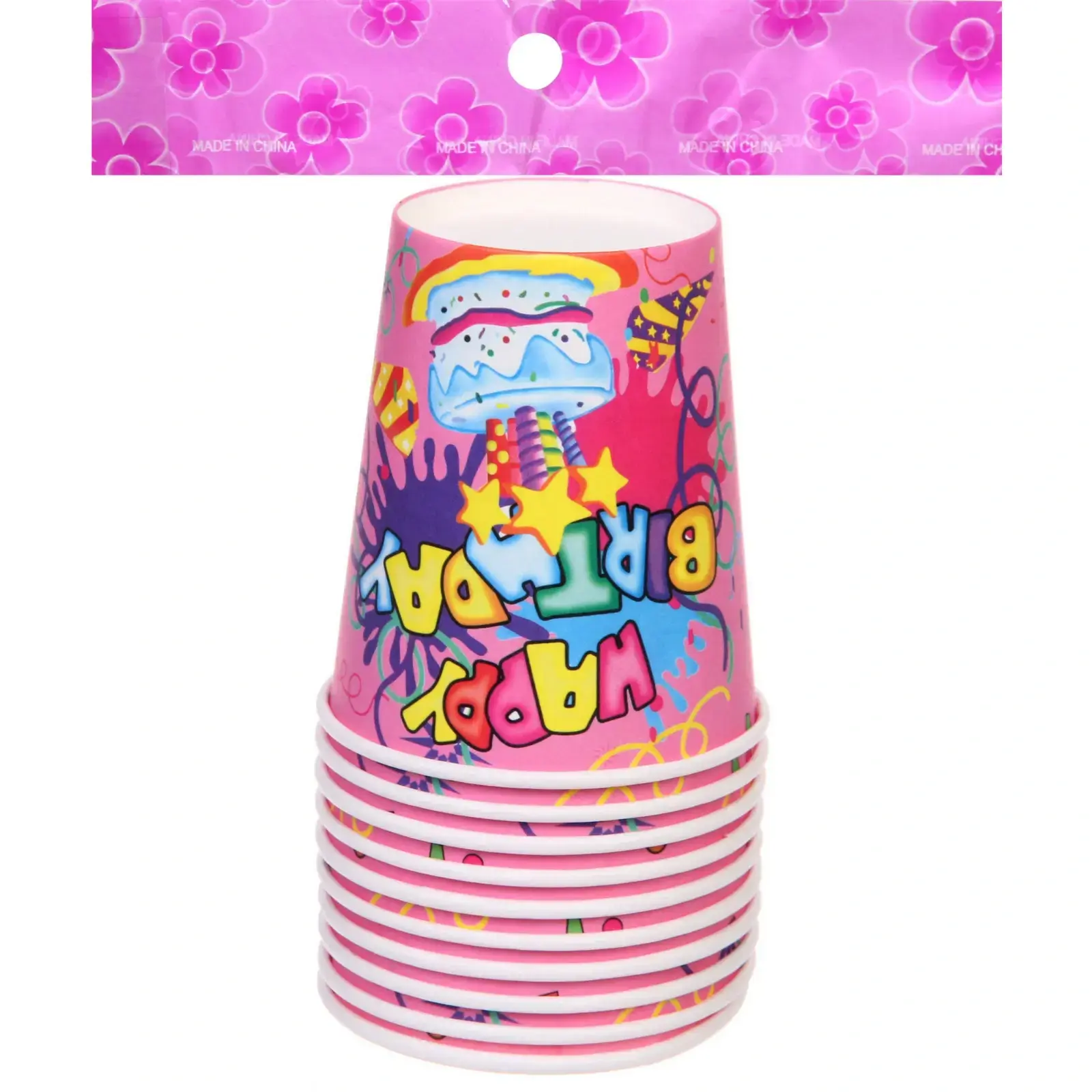 Каждый стакан выполнен из прочной бумаги, что обеспечивает надежность при использовании. Они имеют округлую форму и стандартные размеры, что делает их удобными для держания в руках. Яркий розовый цвет и праздничные элементы, такие как торты и звезды, создают веселую атмосферу, которая понравится как детям, так и взрослым.