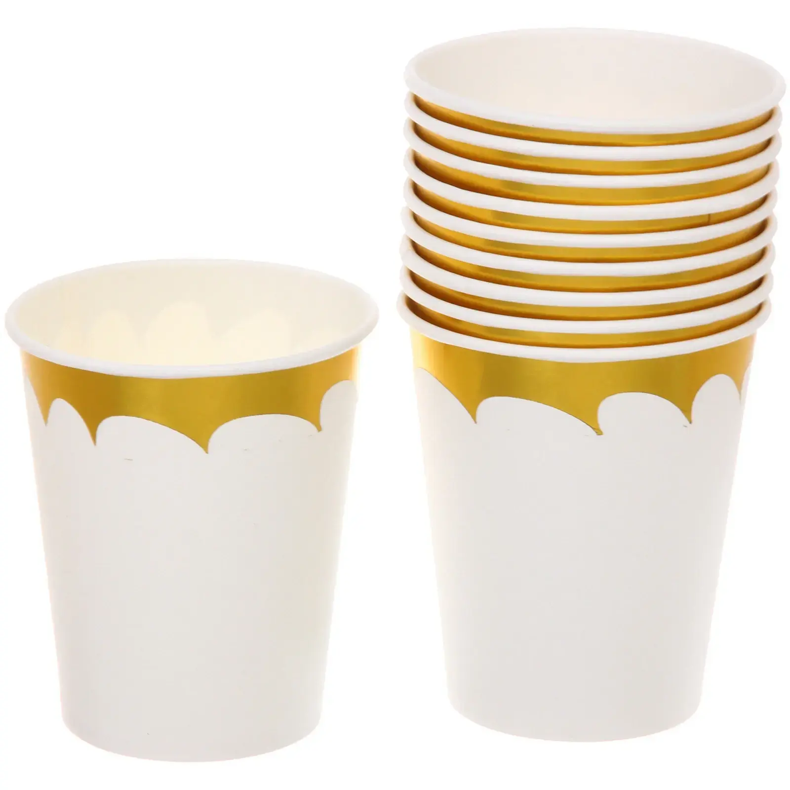 Выбирая наши стаканы, вы получаете не только практичное решение для сервировки напитков, но и стильный элемент декора. Белый цвет с золотистой отделкой придаст вашему мероприятию элегантный вид. Изготовленные из качественной бумаги, стаканы надежны и безопасны для здоровья.