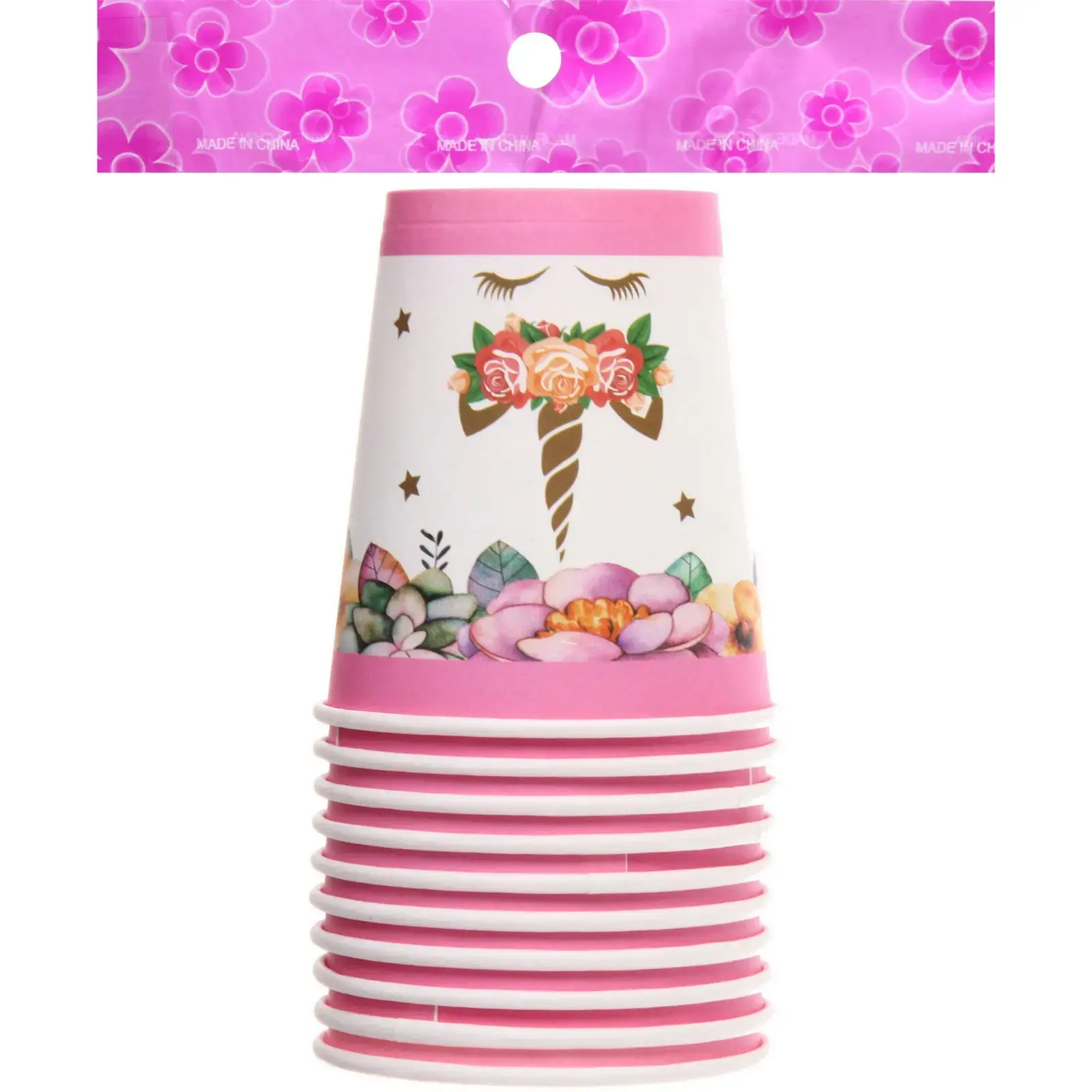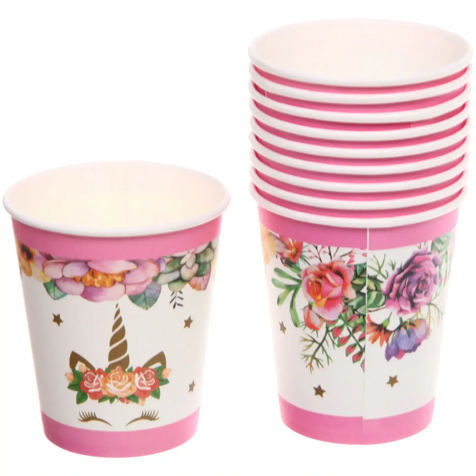 В наборе вы получите 10 стаканов, каждый из которых украшен цветочными мотивами и изображением единорога. Стаканы имеют белый цвет с розовыми элементами, что делает их универсальными для любого праздника. Они идеально подойдут для использования как в помещении, так и на улице. Не упустите возможность сделать ваш праздник ярче и веселее с бумажными стаканами «Цветочный рай»!